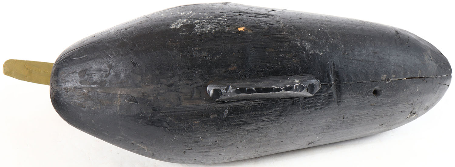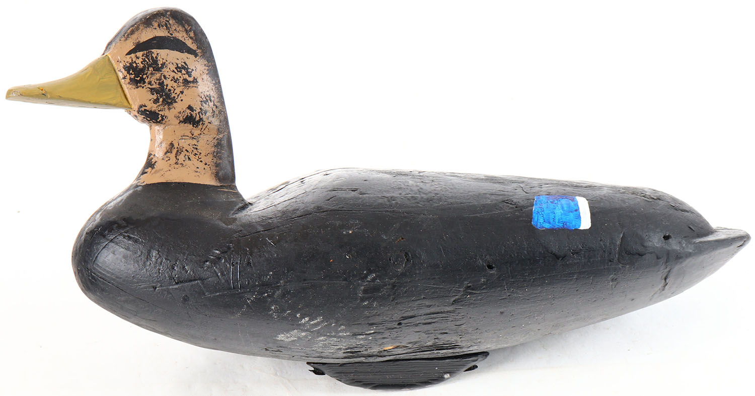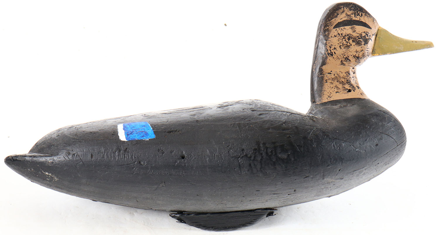Black Duck by unknown maker, painted eyes, solid wood, original paint, has age cracks on back and bottom. Grade: Very Good + - Value: 10 to 20