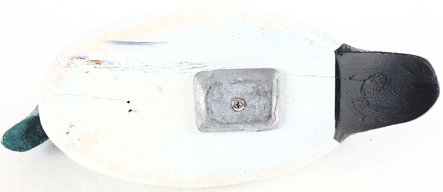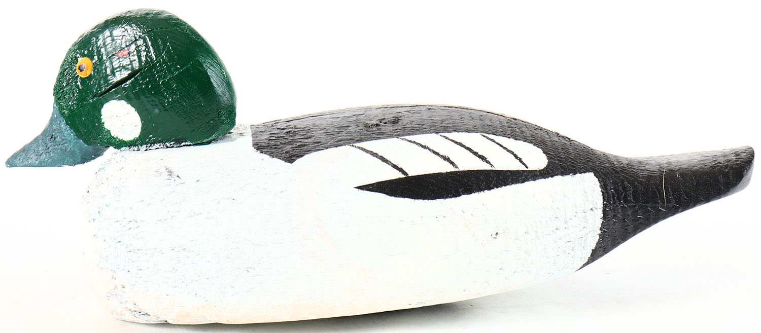 Goldeneye Drake by unknown MS factory, glass eyes, solid wood, working repaint, age cracks on back. Grade: Very Good - Value: 10 to 20