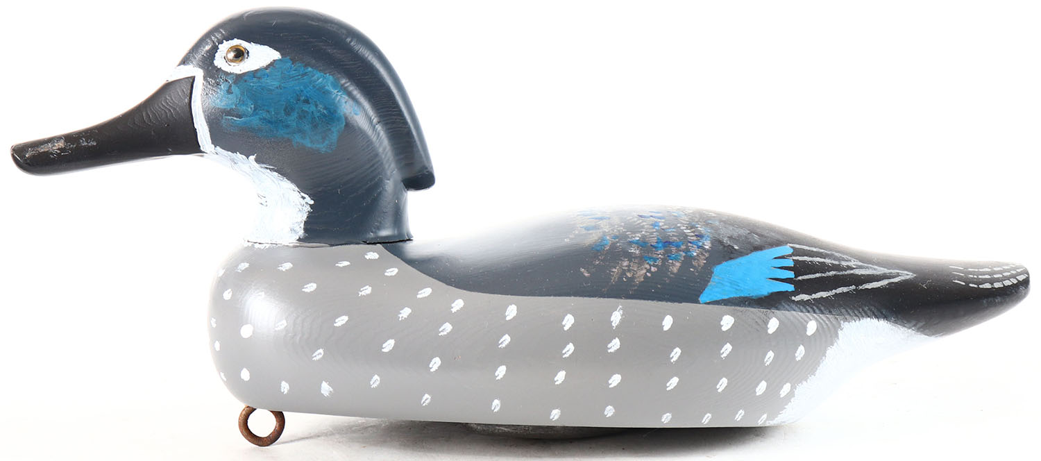 Woodduck Hen by unknown maker, glass eyes, solid wood, repainted, structurally excellent. Grade: Excellent + - Value: 10 to 30
