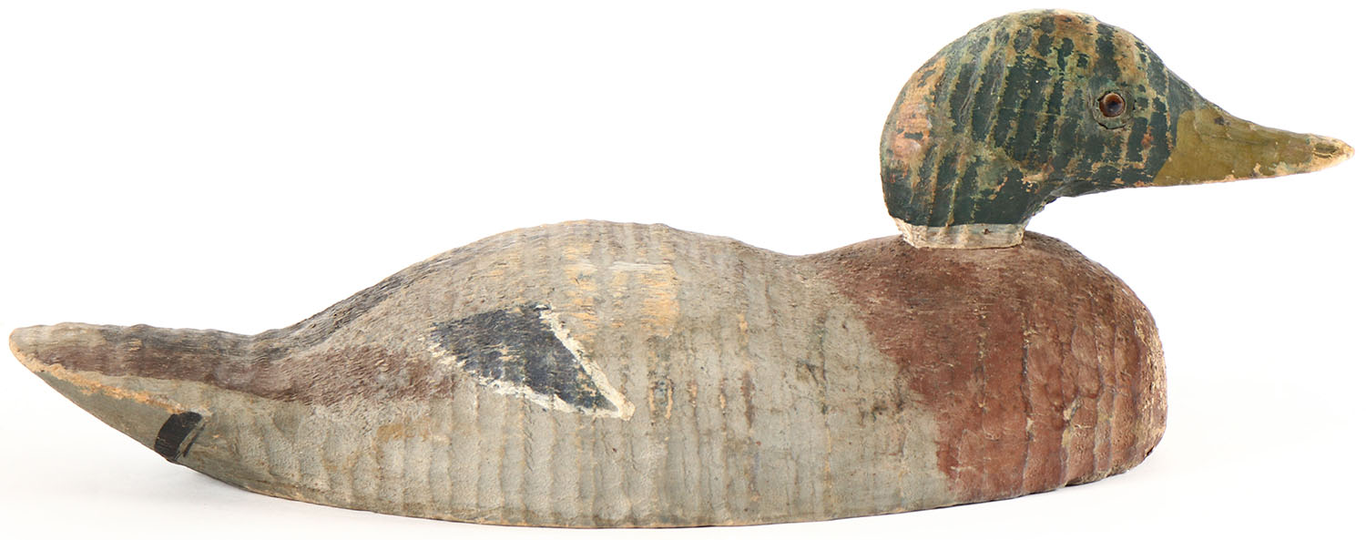 Mallard Drake by a MS factory, glass eyes, solid wood, original paint with typical wear, head is loose. Grade: Very Good ++ - Value: 10 to 20
