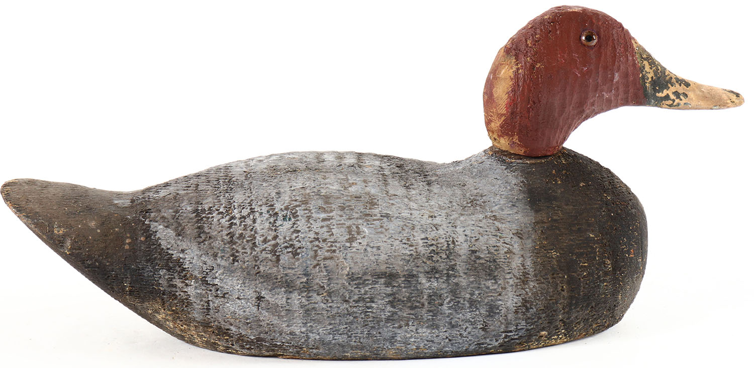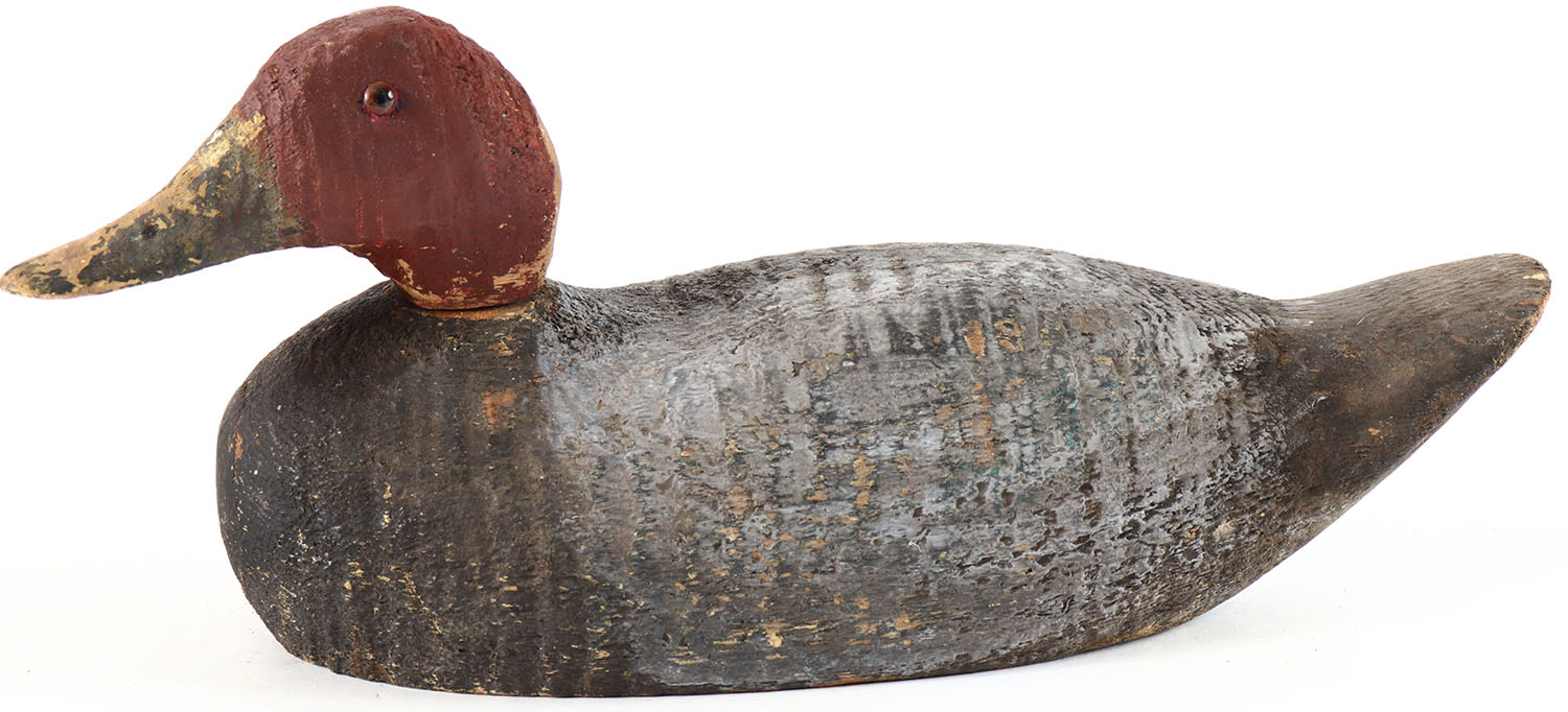 Canvasback Drake by unknown factory, glass eyes, solid wood, working repaint, wear to head, head is loose. Grade: Very Good + - Value: 10 to 20