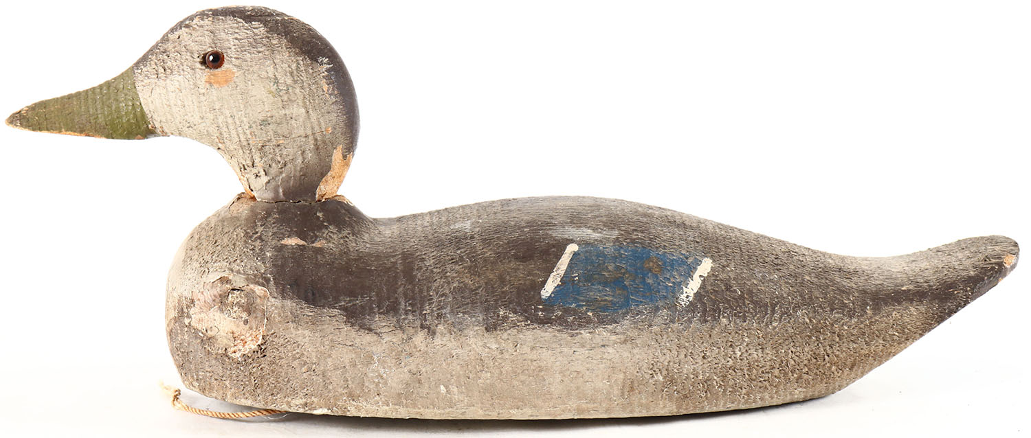Black Duck by Victor Decoys, glass eyes, solid wood, original paint, branded by VICTOR DECOYS on bottom, head is loose. Grade: Very Good + - Value: 10 to 20