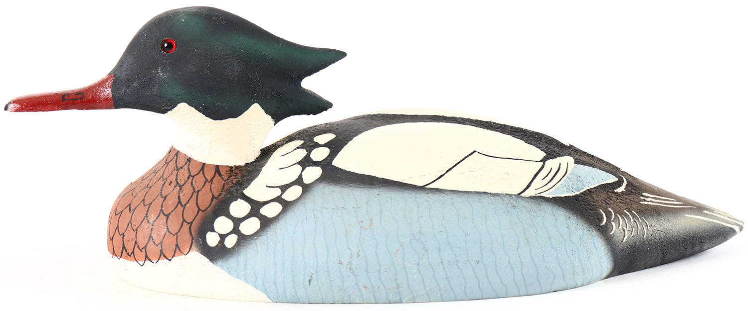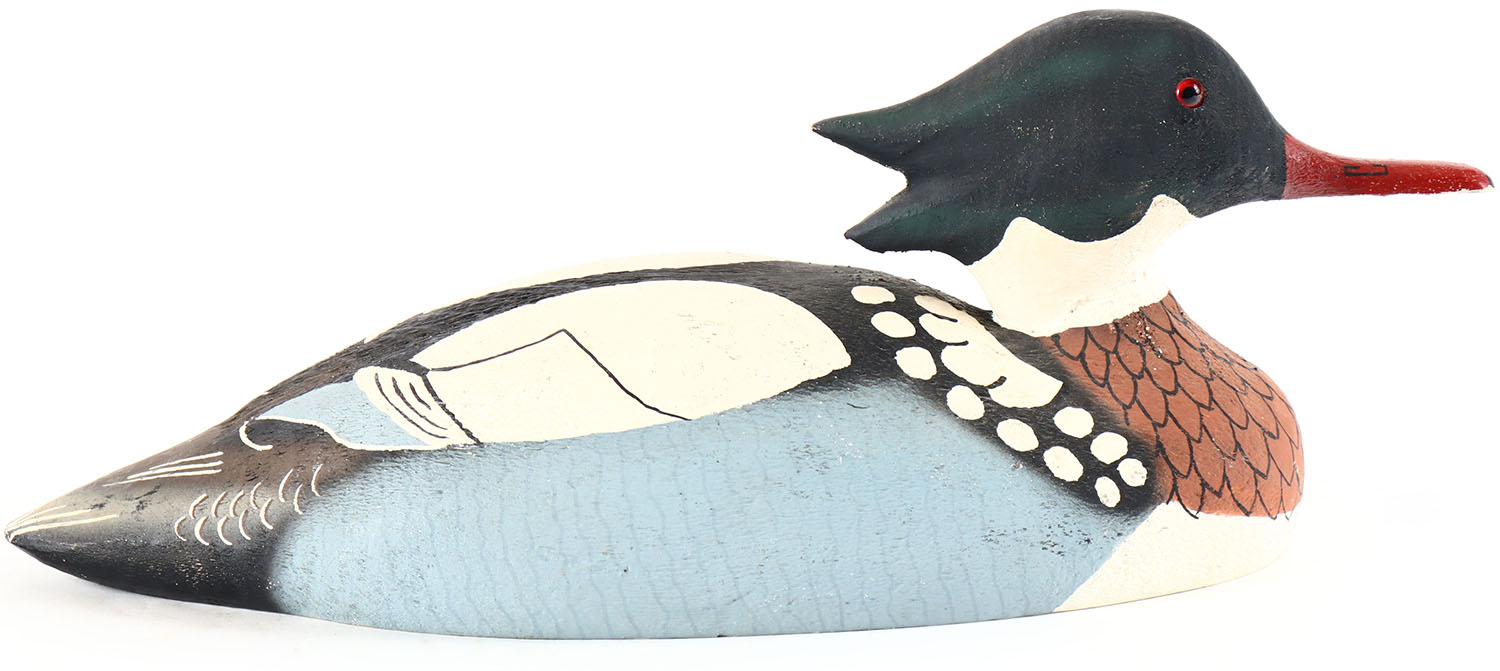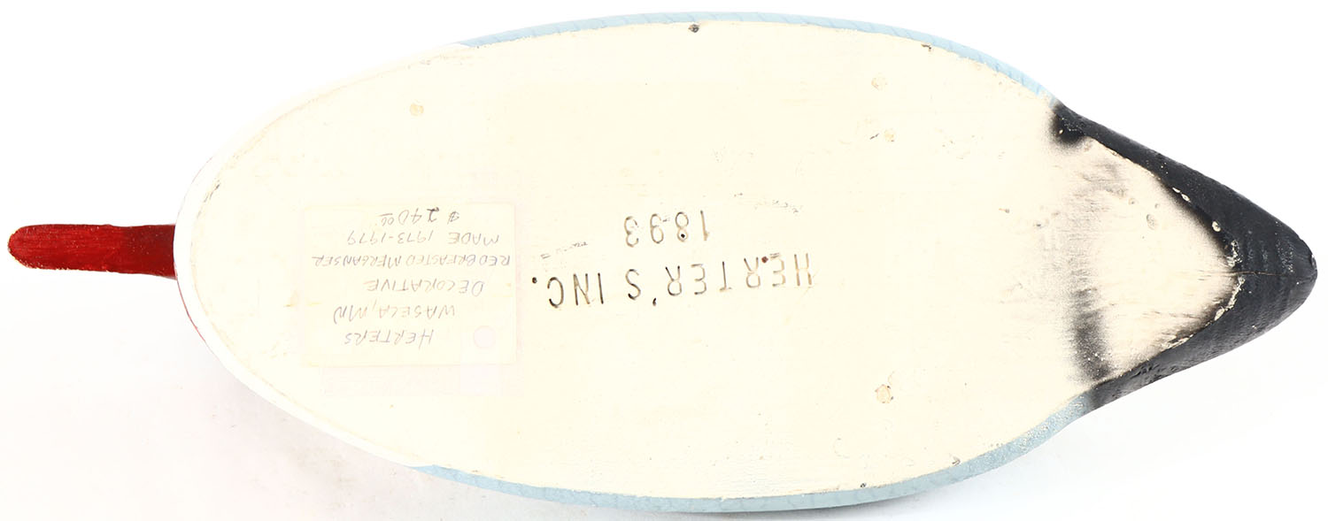 Red Breasted Merganser by Herters Decoy Co., Waseca, MN, 1893 series, glass eyes, solid wood, original paint, structurally excellent, brand on bottom. Grade: Excellent + - Value: 60 to 120
