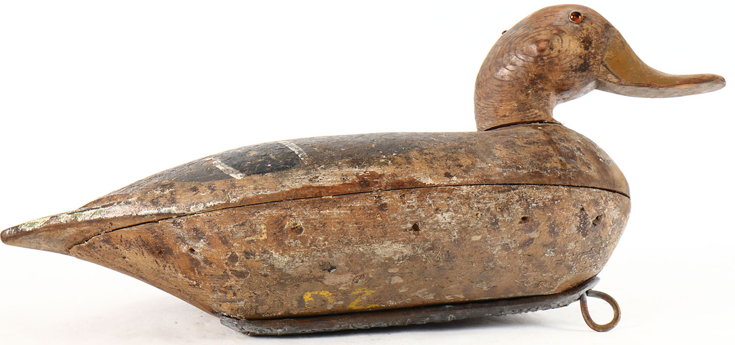 Hen Mallard by an Illinois River carver with a Henry Perdew weight, glass eyes, solid wood, mostly worn original paint, age crack under neck. Grade: Very Good + - Value: 70 to 150