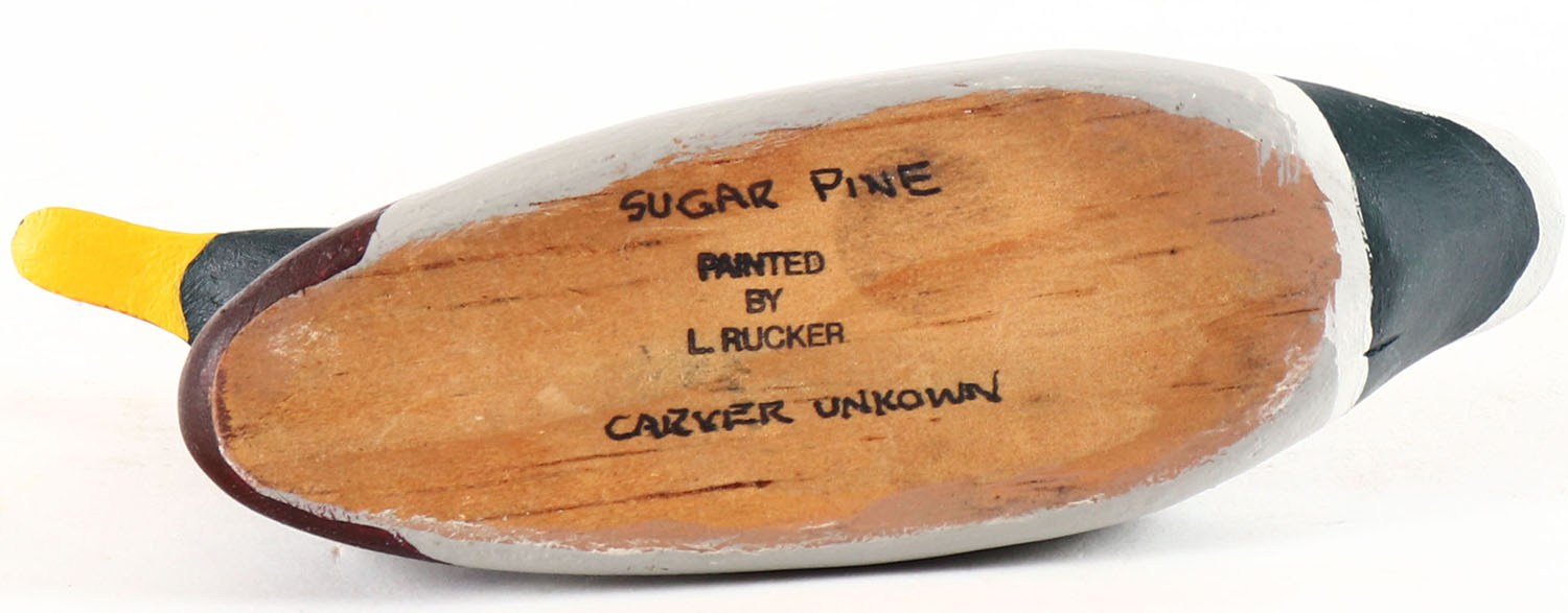 Miniature Mallard Drake by unknown maker, glass eyes, solid wood, painted by Larry Rucker, structurally excellent. Grade: Excellent ++ - Value: 10 to 80