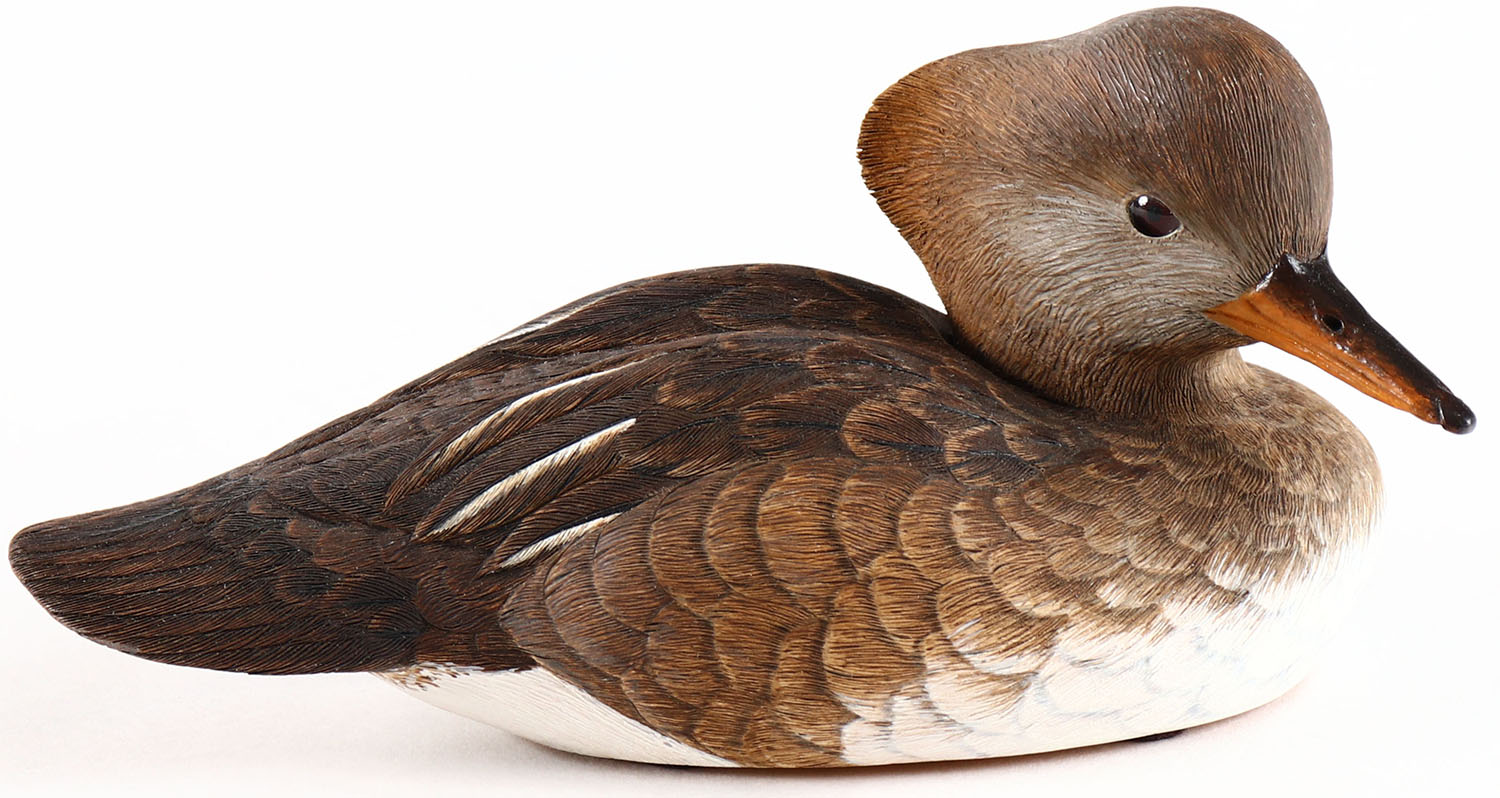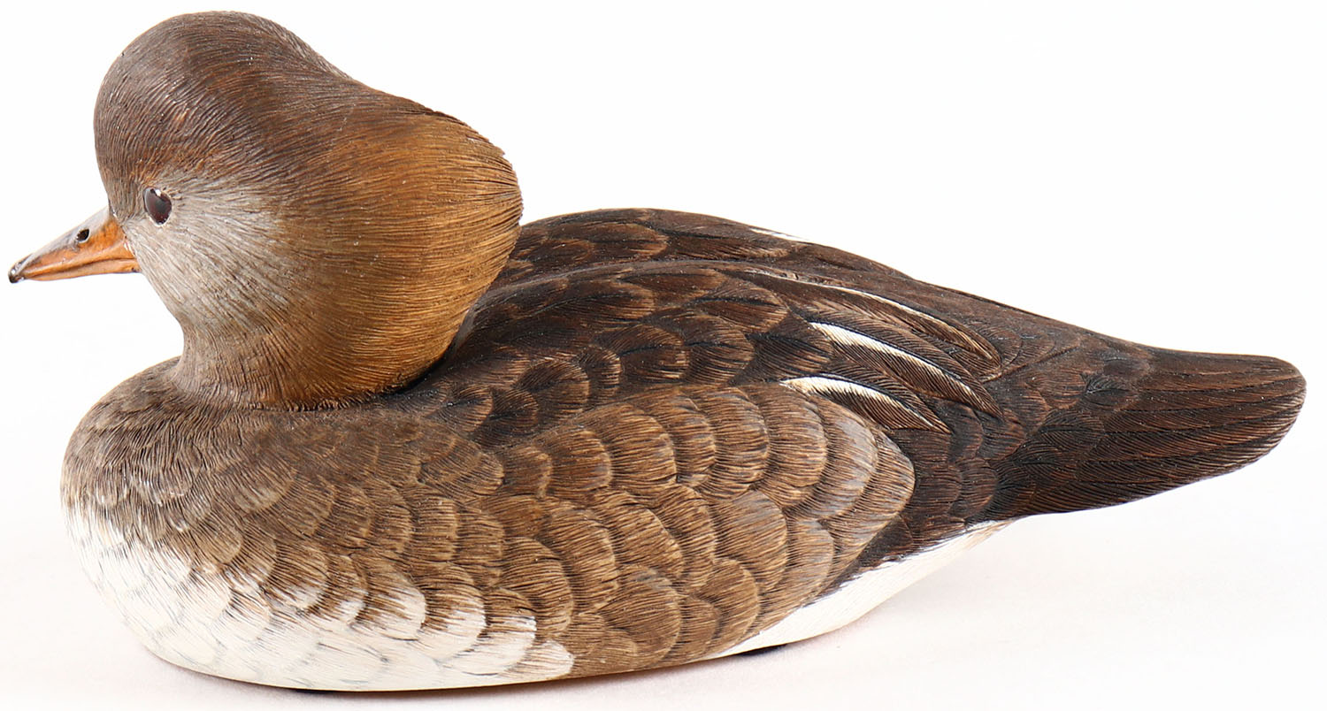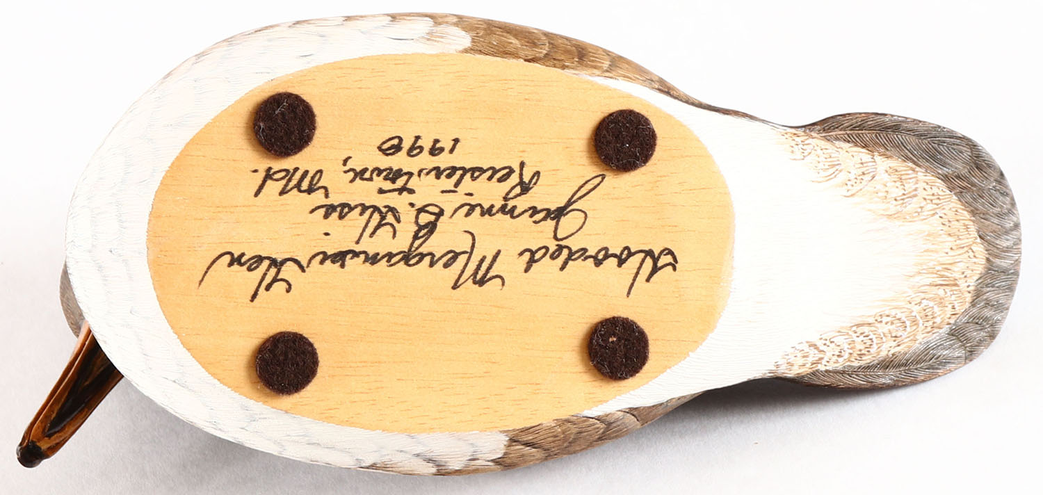 Miniature Merganser Hen by Jeanne B. Hiss, Reisterstown, MD, glass eyes, solid wood, original paint, structurally excellent, signed on bottom. Grade: MINT - Value: 20 to 100