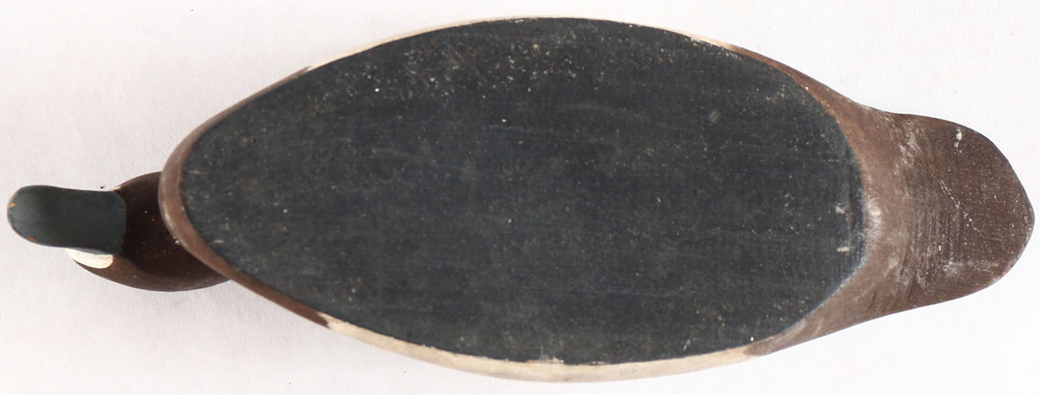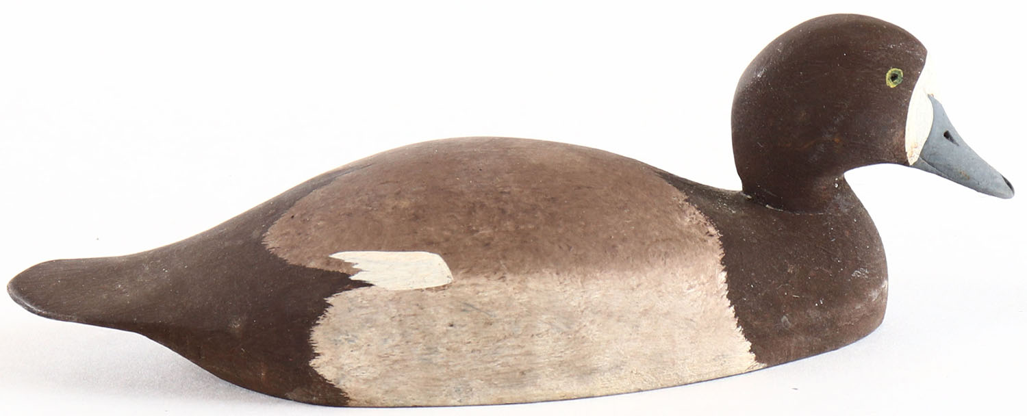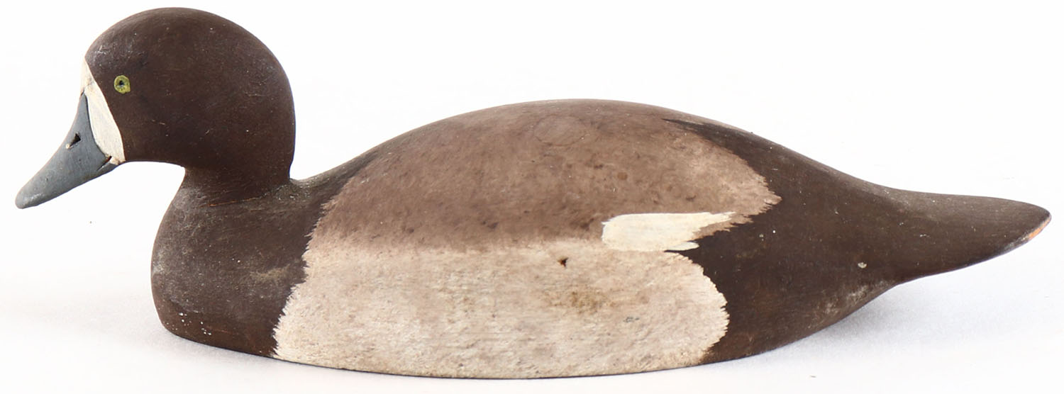 Miniature Bluebill Hen by unknown maker, painted eyes, solid wood, original paint, structurally excellent. Grade: Excellent ++ - Value: 2 to 60