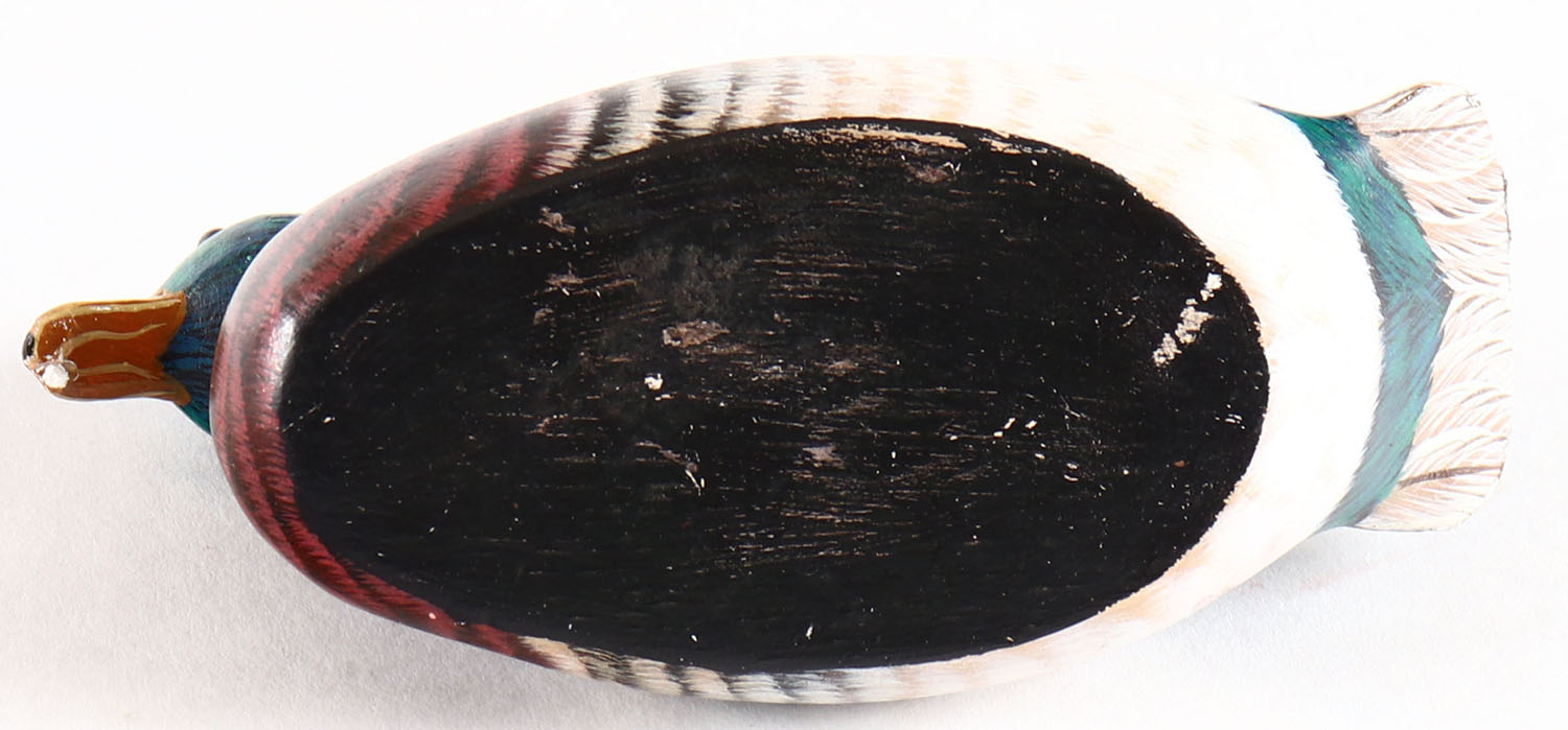 Miniature Mallard Drake by unknown maker, glass eyes, solid wood, original paint structurally excellent. Grade: MINT - Value: 6 to 30