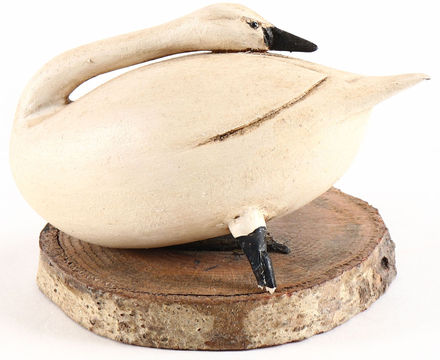 Miniature Swan by Paul Carter, painted eyes, solid wood, on wood stand, body broke off of wood stand. Grade: Fair - Value: 2 to 60