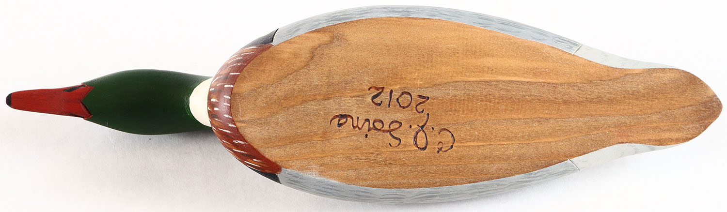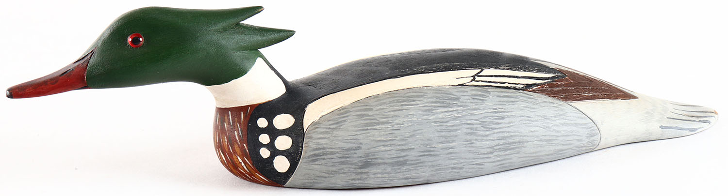 Swimming Red Breasted Merganser by C.J. Soine, glass eyes, solid wood, original paint, structurally excellent, branded on bottom. Grade: Excellent + - Value: 10 to 60