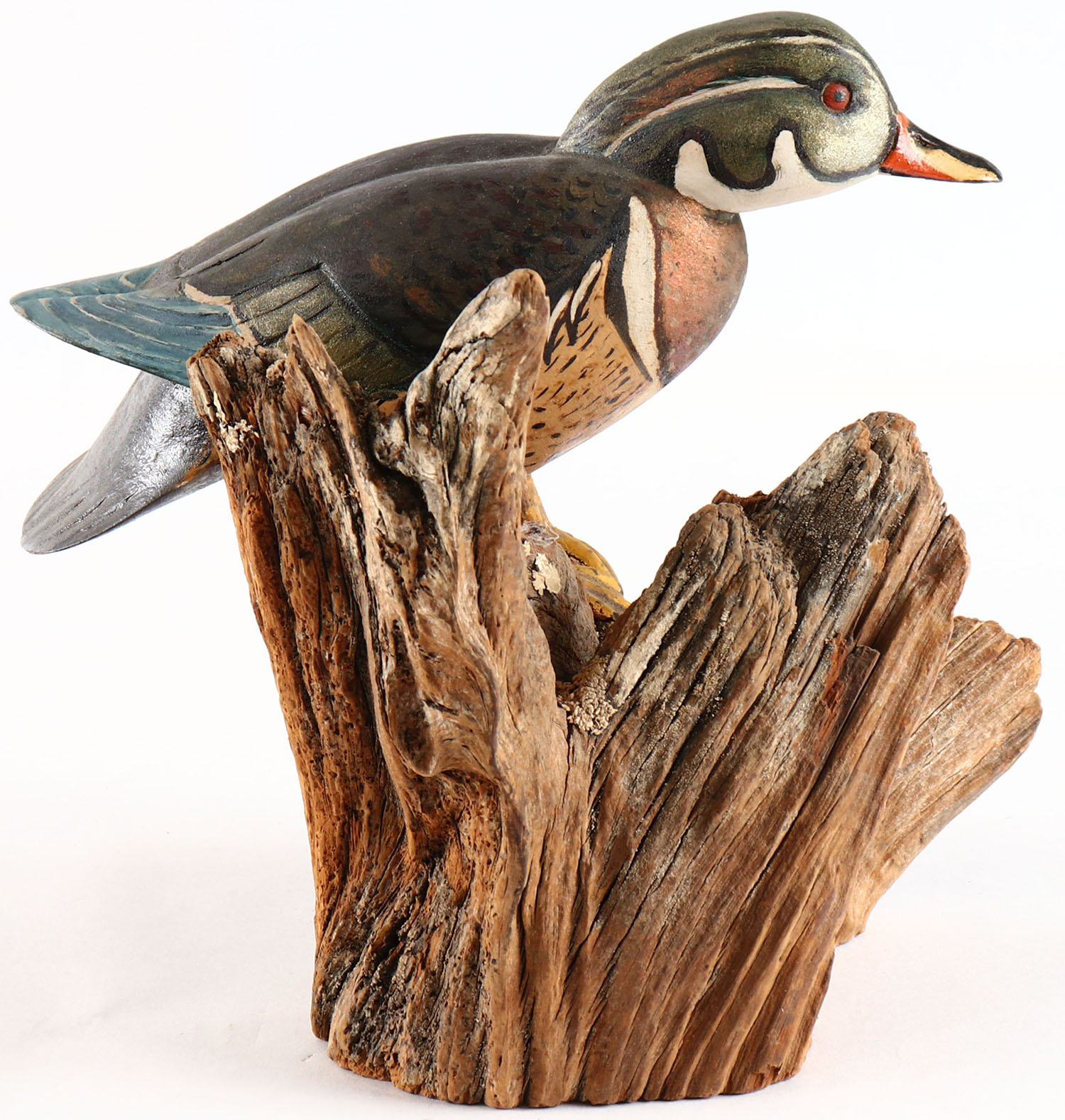 Woodduck Drake by Ducks Unlimited, on wood stand, glass eyes, solid wood, original paint, structurally excellent. Grade: Excellent ++ - Value: 10 to 60