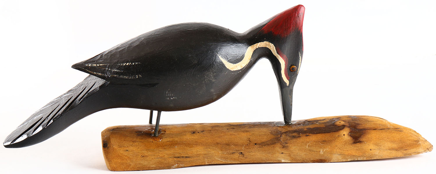 Pileated Woodpecker by Jim Slack, tack eyes, solid wood on wood stand, original paint, structurally excellent, signed on bottom. Grade: Excellent + - Value: 10 to 60