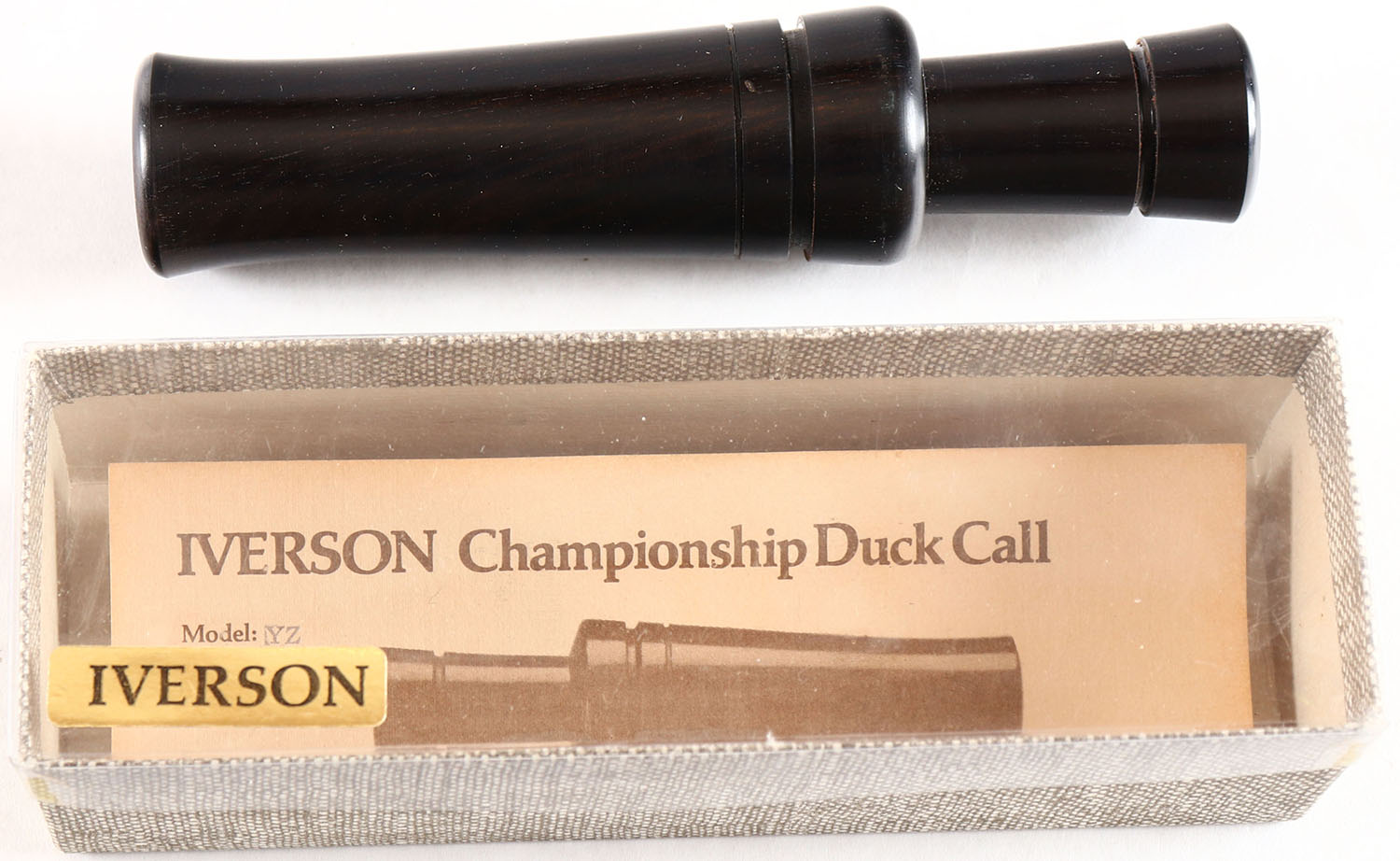 Iverson Duck call in original box, Model XY, has paper work, Rosewood barrel & stopper, sounds great. Grade: Excellent ++ - Value: 40 to 200