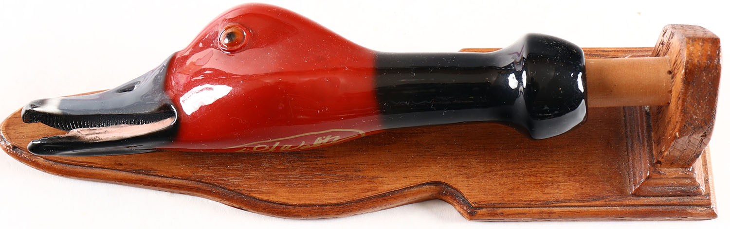 Very unique, hard to find Redhead Duck Call by L.J. Walton. Detailed handcrafted, signed, dated, and sounds like a Redhead when you blow it. Measures 7'' long, has wood stand. Grade: MINT - Value: 50 to 200