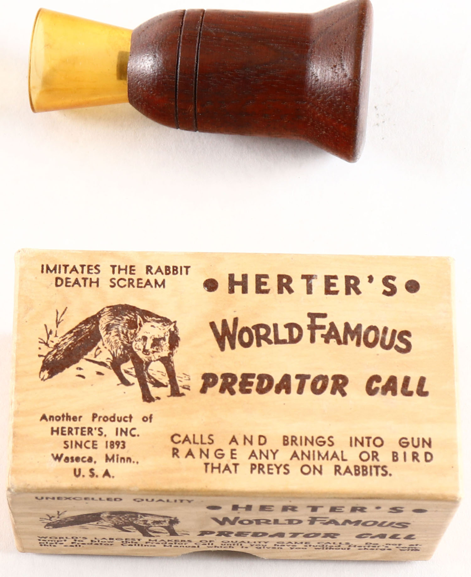 Herter's Predator call in the original box, walnut barrel with amber stopper. Grade: Excellent ++ - Value: 10 to 50