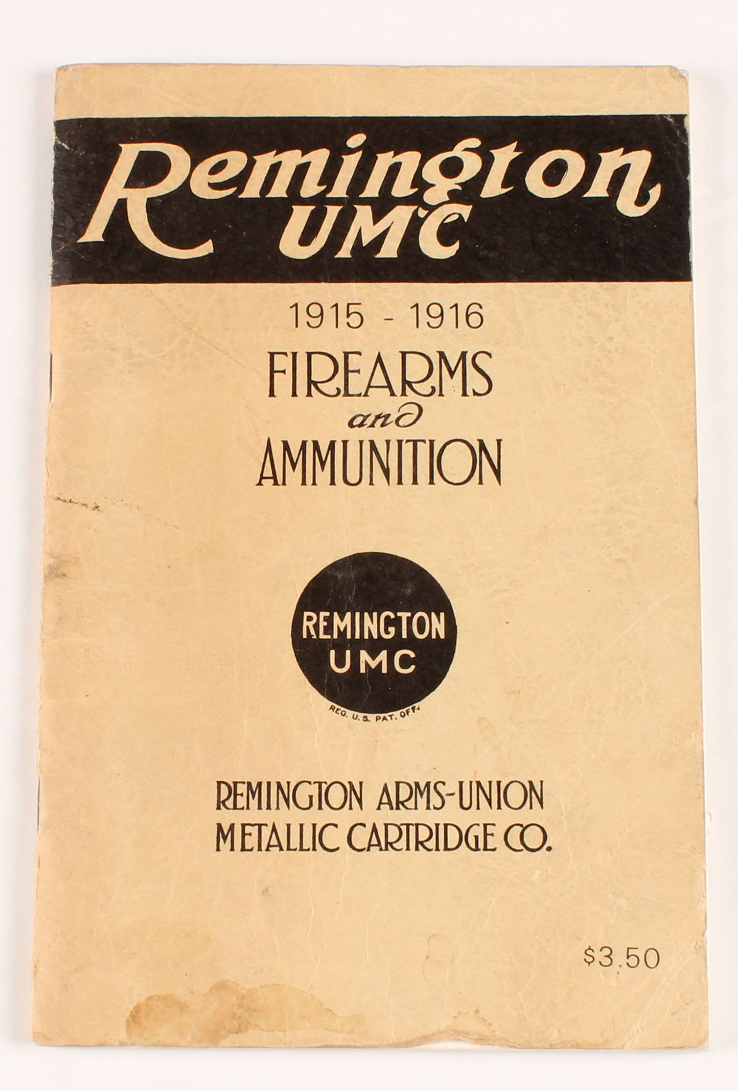 Remington UMC 1915-1916 Firearms and Ammunition, 5'' x 8''. 80 pages, pages clean, staplebound, has some stains on cover. Value: $15 Grade: Very Good ++ - Value: 3 to 15