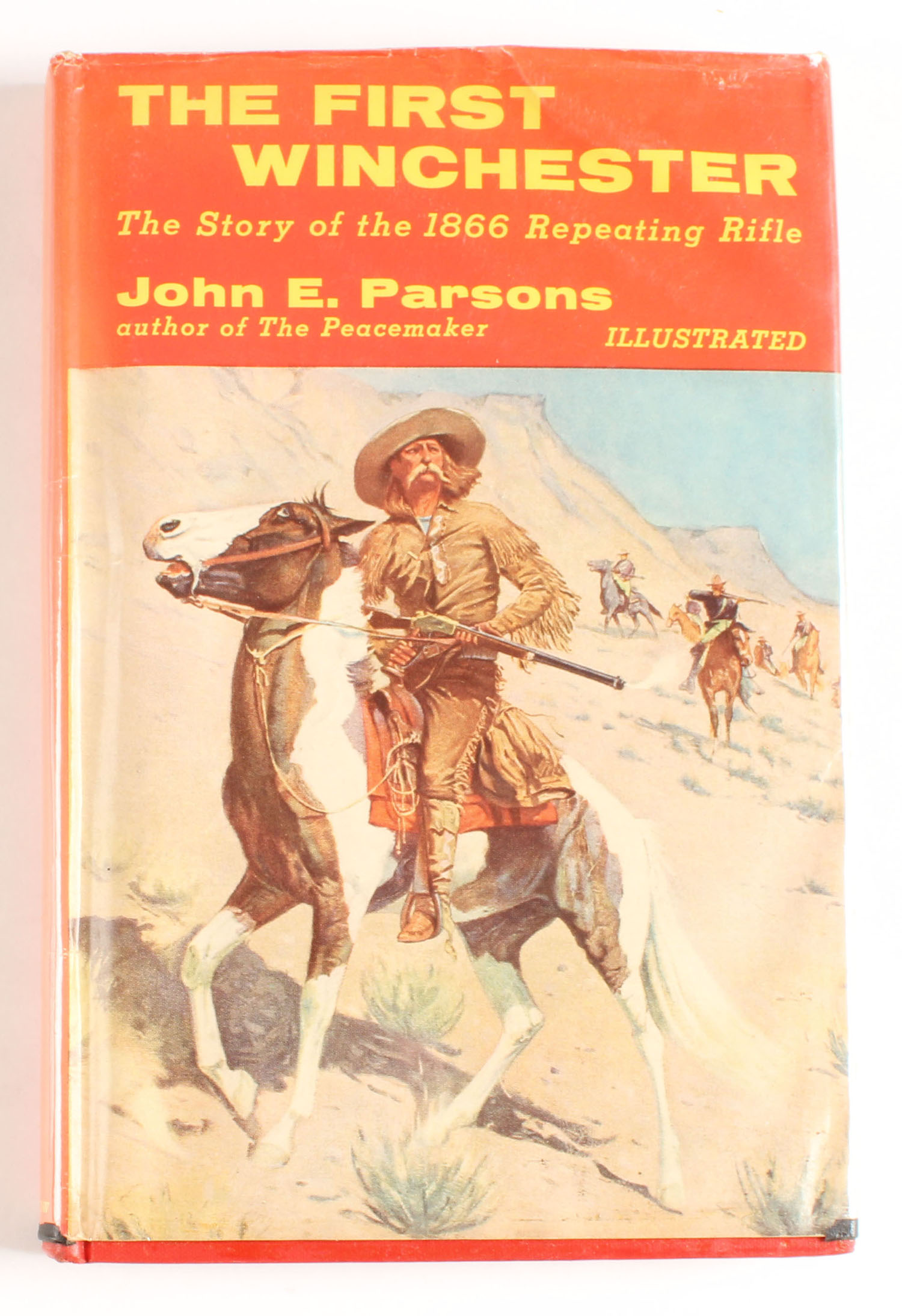 The First Winchester: The Story of the 1866 repeating rifle by John E. Parsons 1955, 6'' x 9''. 207 pages, pages clean, binding tight, hardcover and dustjacket very good, b/w images. Value: $60 Grade: Very Good + - Value: 2 to 60