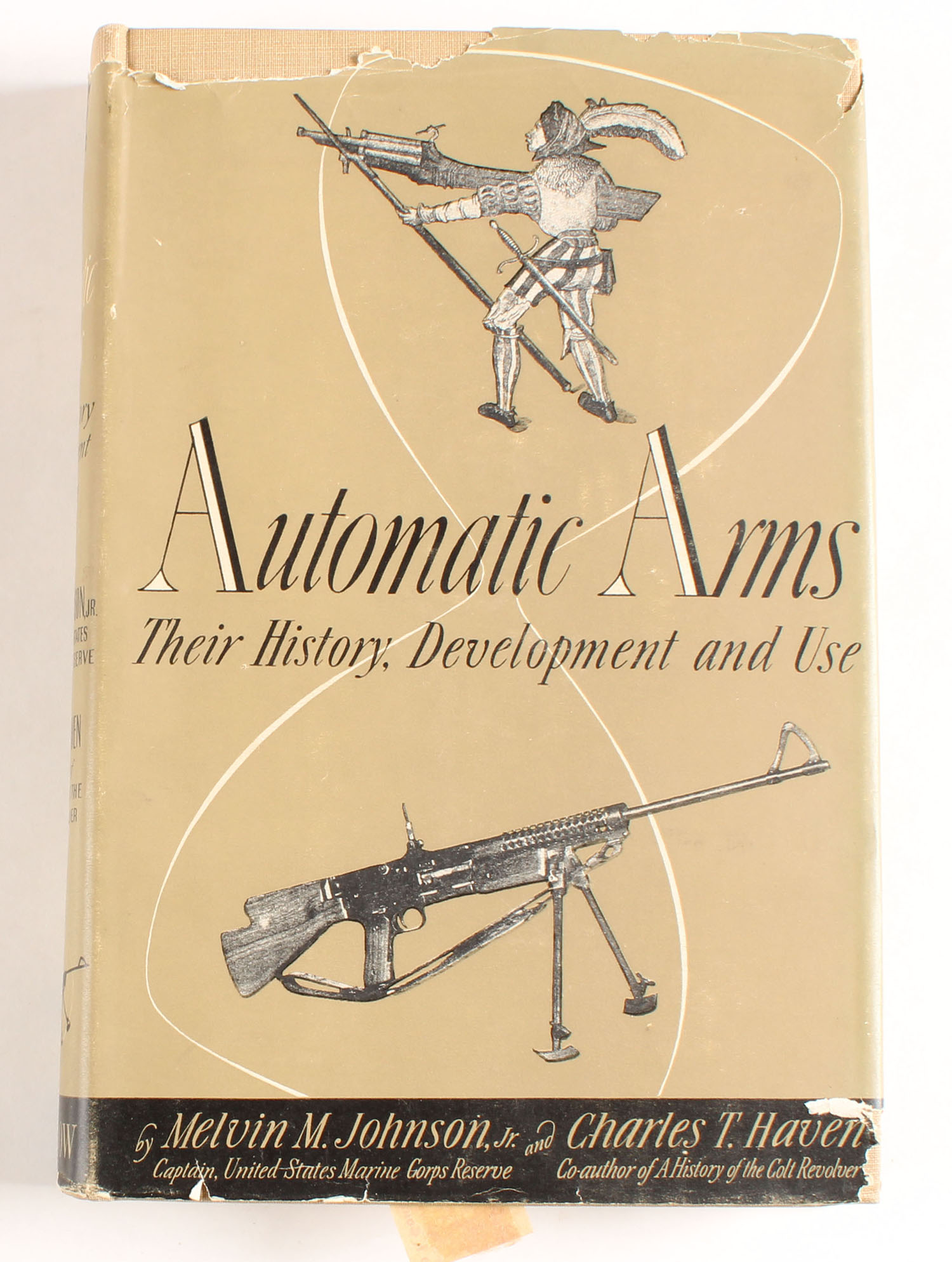 Automatic Arms: Their History, Development and Use by Melvin M. Johnson, Jr. and Charles T. Haven 1941, 6 1/2'' x 9 1/2''. 366 pages, pages clean, binding tight, hardcover very good, dustjacket has tears, b/w images. Grade: Very Good + - Value: 3 to 30