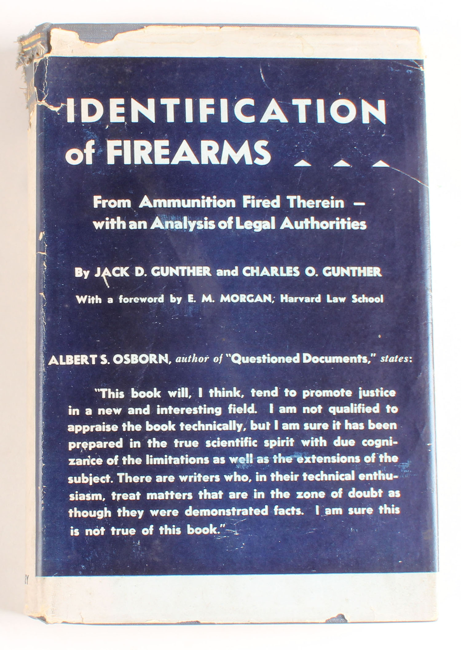 The Identification of Firearms by Jack Disbrow Gunther, A.B., LL.B and Charles O. Gunther, M.E. 1935, 6'' x 9 1/2''. 342 pages, pages clean, hardcover very good, dustjacket has some tears, binding tight, b/w images. Grade: Very Good + - Value: 2 to 60