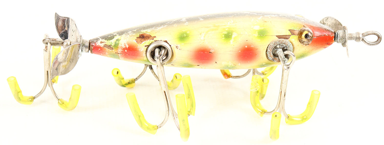 Pflueger Monarch Minnow, unmarked, STRAWBERRY finish, GE, 5 hook lure, Neverfail hdw, paint shows scuffing & chipping, hard to find lure. Grade: Very Good ++ - Value: 26 to 200