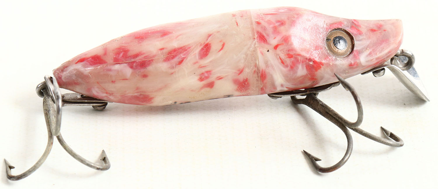 Heddon River Runt Spook Floater, has marked belly, red & white marble pattern, PE, 2 hook lure, Surface-Rig. Grade: Excellent - Value: 6 to 30