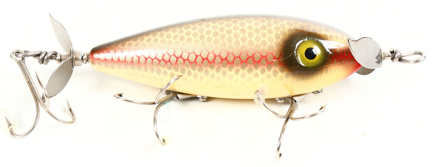South Bend Surf Oreno, PE, cream scale finish in near mint condition, 3 hooks, surface rig. Grade: Excellent + - Value: 20 to 80