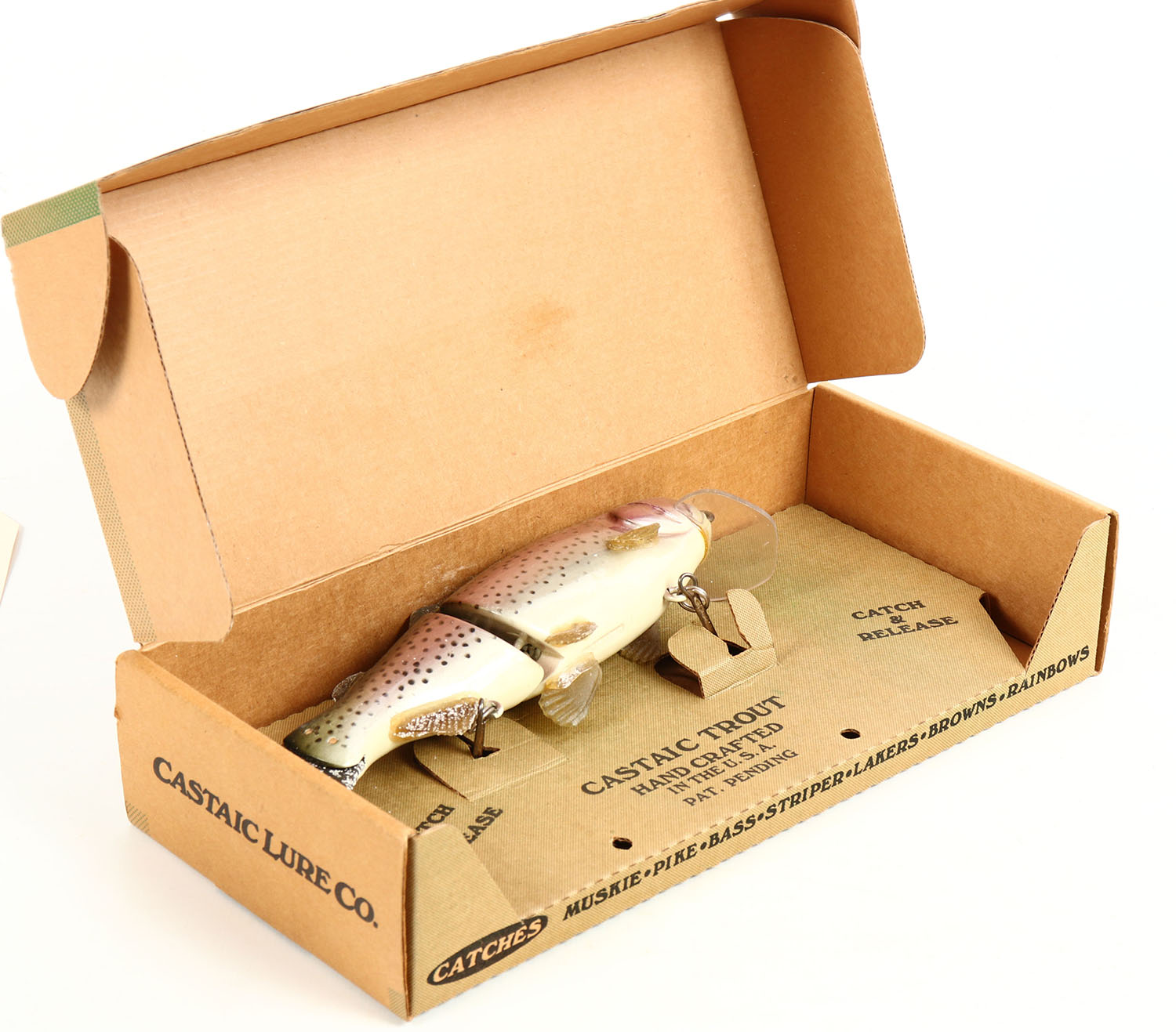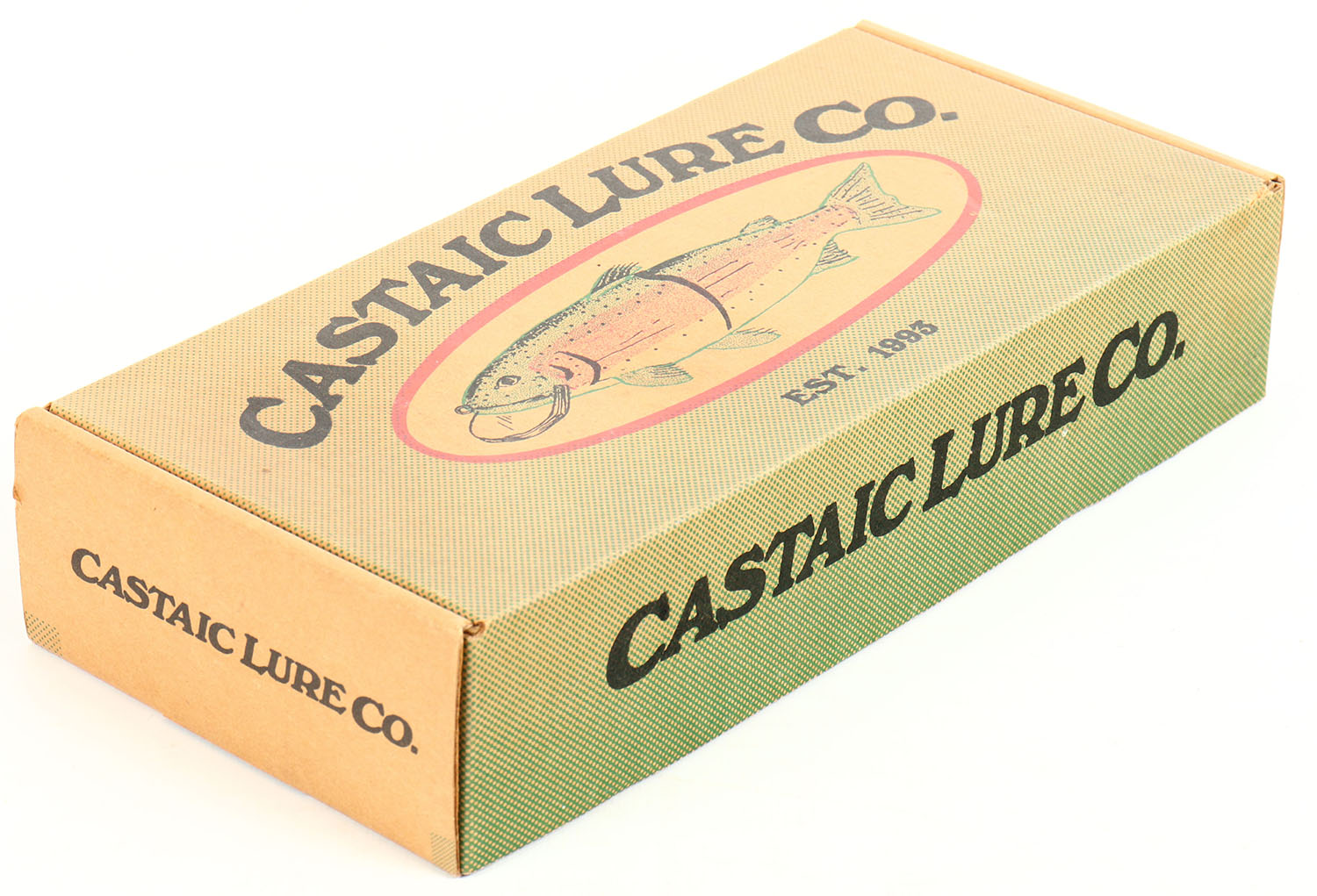 Castaic Lure Co., Castiaic Trout, hand crafted, 8 3/4'', Rainbow Trout colors, GE, 2 hooks, nice original box. Grade: MINT - Value: 50 to 100