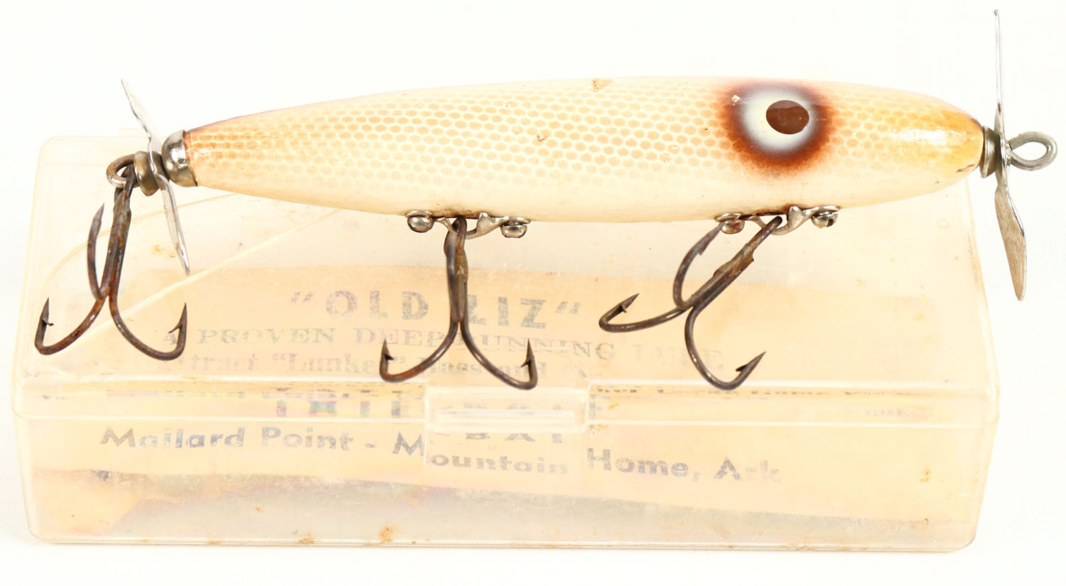 | Tate-Bait OLD LIZ lure in original box, white & brown scale, PE...