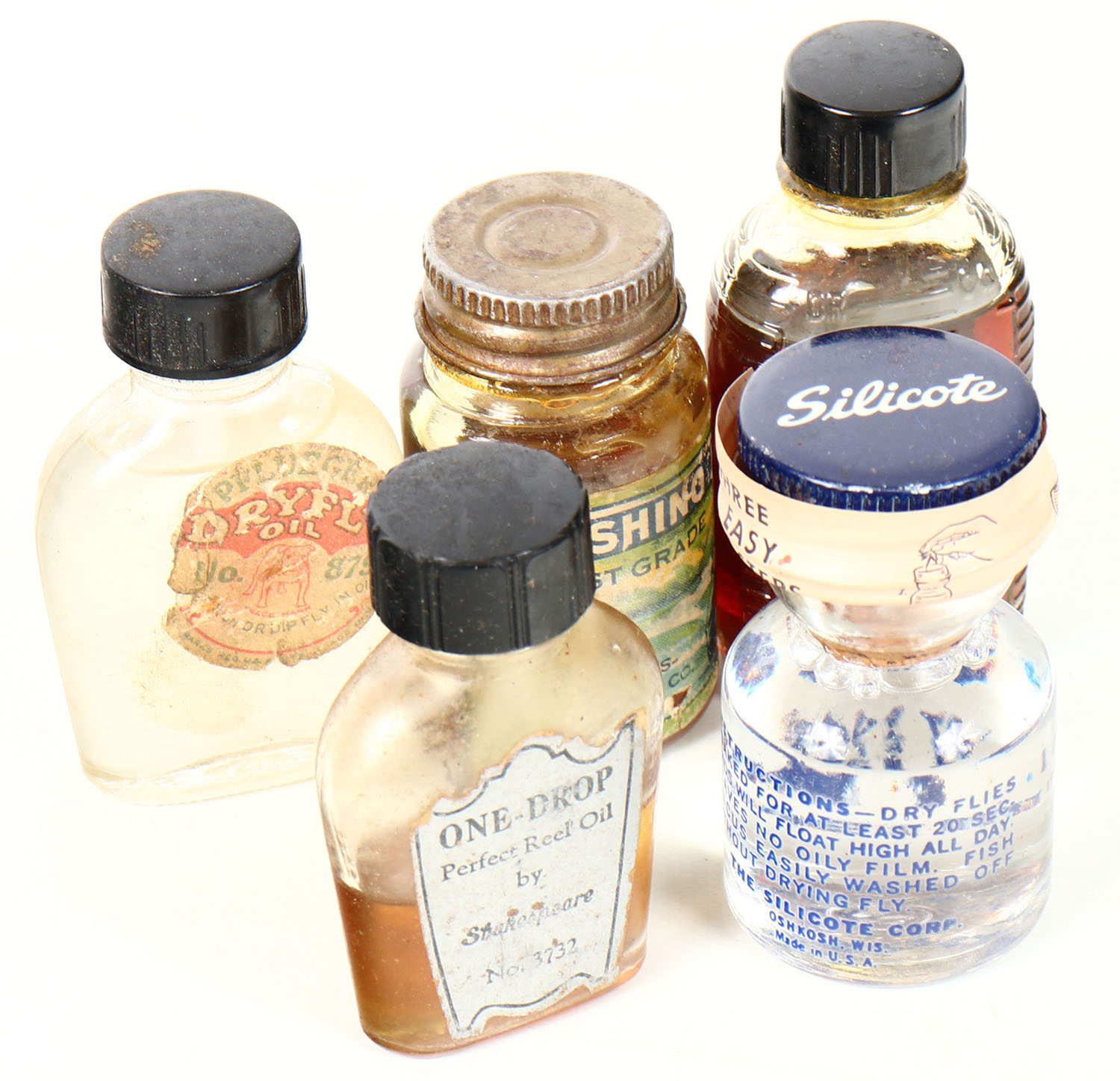 Lot of fly fishing glass bottles most are full. Grade: Excellent - Value: 10 to 40
