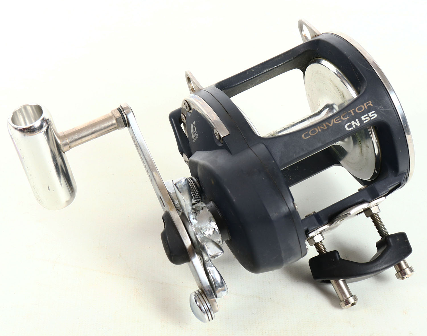 Okuma Convector CN55 salt water reel, clamp mount, large metal handle, belt mounting holds for leverage. Grade: Excellent - Value: 10 to 60