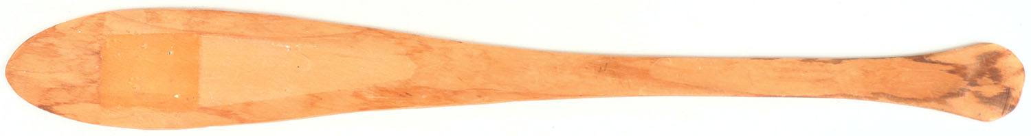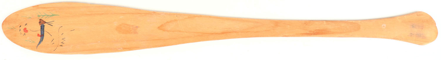 Small paddle with full color Indian camp scene & possibly made by an Indian, 17'' long. Grade: Excellent - Value: 10 to 50