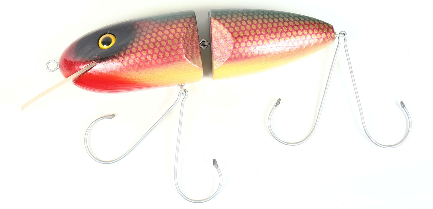 Large Jointed wood Sporting Goods store lure by Carl's Shore Birds, NY, lure is flat on the back sot for wall mounting, beautiful original paint, 2 hooks, 17'' OAL, Grade: Excellent - Value: 20 to 100