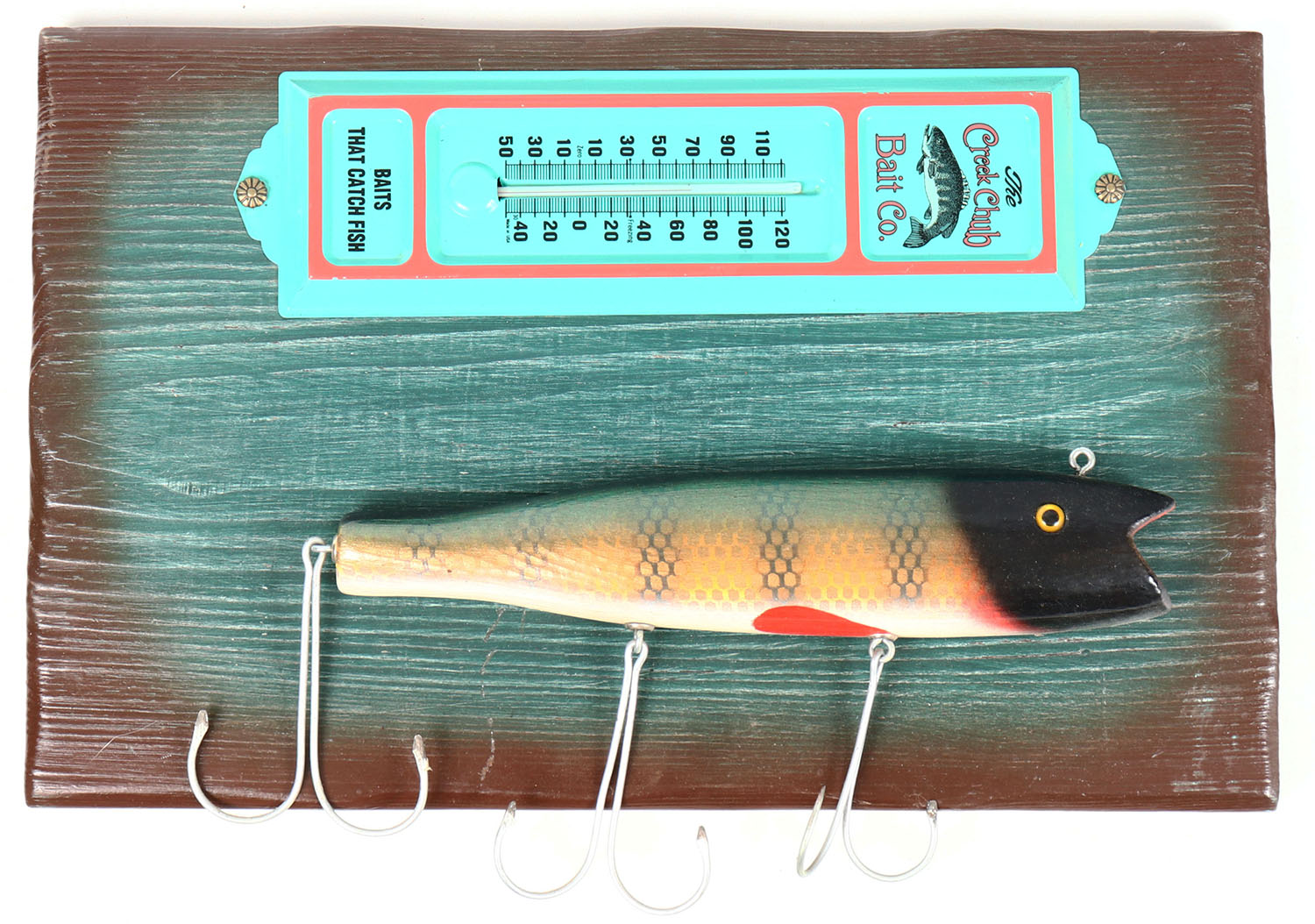 Fishing lure & thermometer mounted on wood plaque, in the style of Creek Chub Bait Co., 12'' x 18''. Grade: MINT - Value: 20 to 100