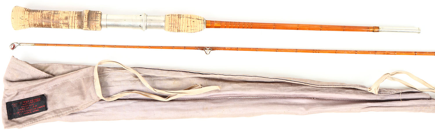 Winchester Bamboo casting rod, No. 6370, 5', 2/1, cork has been used & then re-sanded to clean it up otherwise a nice Winchester rod, has rear Winchester marked cloth bag. Grade: Very Good ++ - Value: 40 to 200