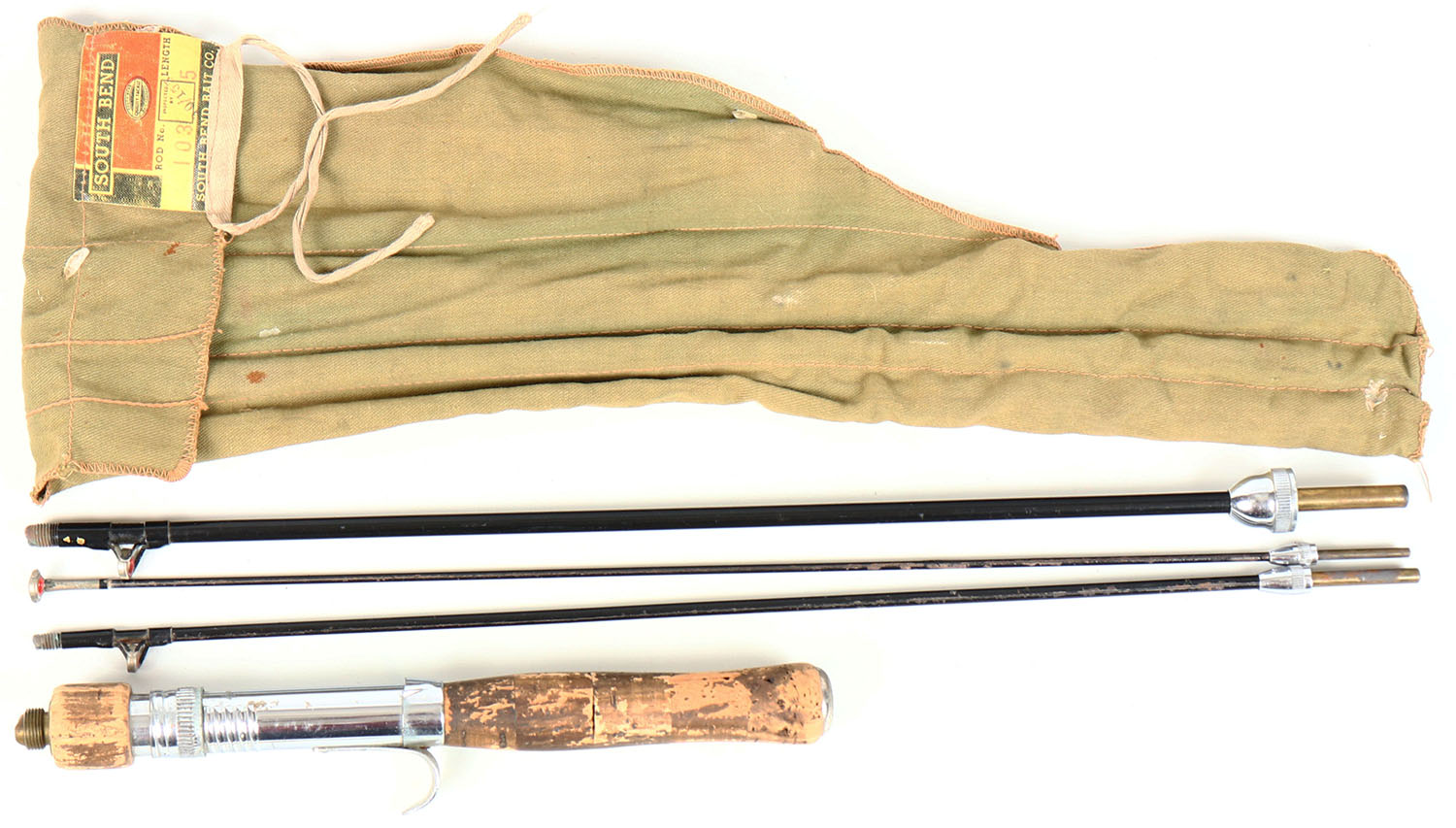 South Bend 4pc. Steel casting rod No. 105, 5', all orignal and correct length, cork handle shows use but still nice, unmarked on reel seat, has marked cloth bag. Grade: Excellent - Value: 20 to 60