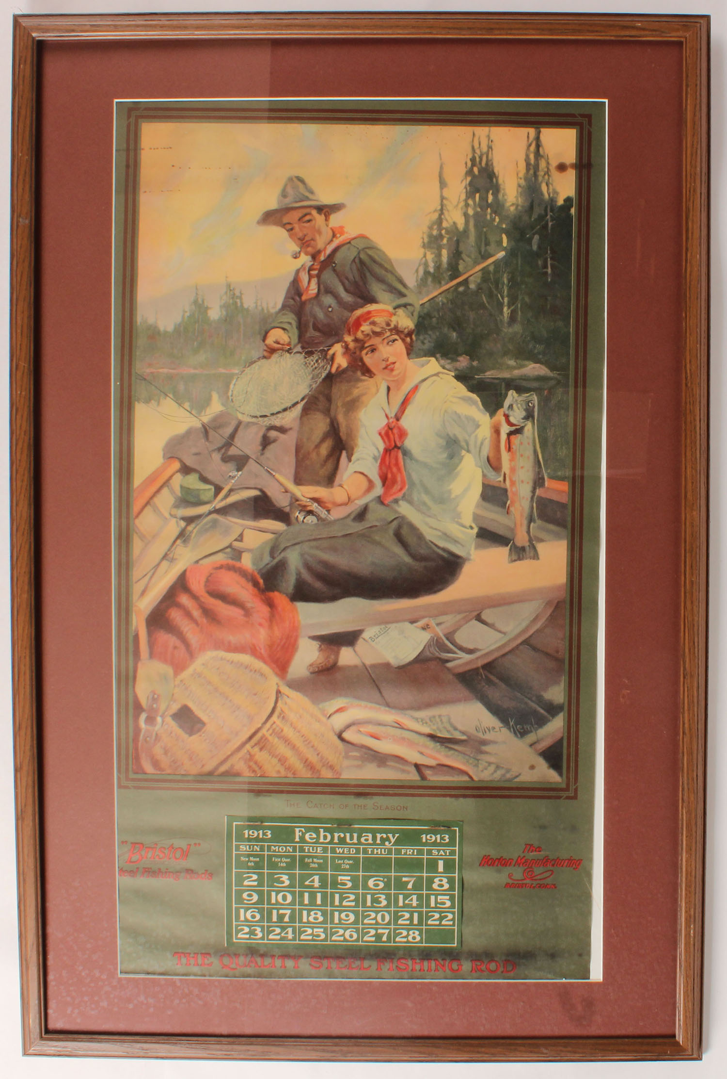 RARE 1913 BRISTOL Calendar by Oliver Kemp, THE CATCH OF THE SEASON, pictures wonderful full colored image of man & woman in a boat landing large brook trout, she is holding one & there are two on the floor of the boat, ''Bristol Steel Rods'', ''Horton MFG Co.'', has no metal bands top or bottom, Feb. page, 28 3/8'' x 16 3/4'', shows almost no edge wear with a small stains to top & a few on bottom, no roll wrinkles, framed. Grade: Very Good ++ - Value: 800 to 3000