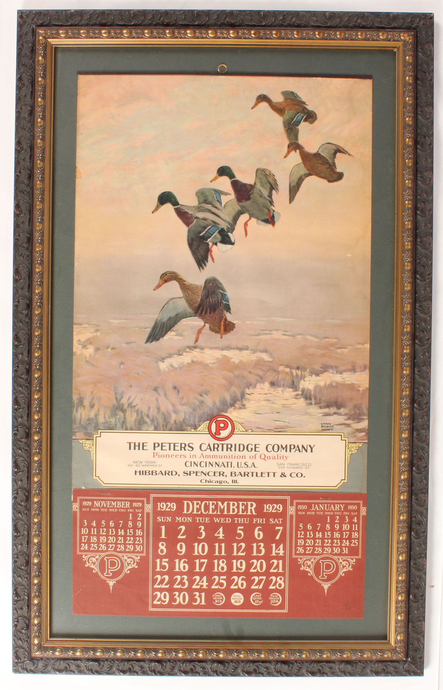 1929 Peters Calendar by Lynn Bogue Hunt, wonderful full color image of mallards cupping into the marsh below, has metal band on top with brass hanger, 15'' x 28'', has Dec. Page, near perfect with one tear repair to top left, framed. Grade: Excellent ++ - Value: 600 to 1500