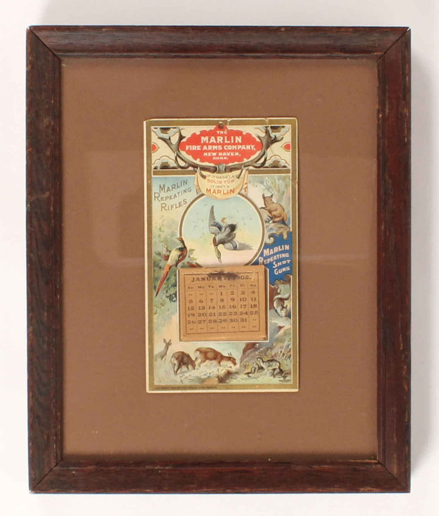 1902 Marlin Fire Arms Co. Mini Calendar, ''Repeating, Rifle and Shot Guns'', full color image of duck falling with many game animals and birds with gold outer edges, Full pad of pages, 3 1/2'' x 6 1/4'', light wear to top otherwise excellent, framed. Grade: Excellent - Value: 500 to 1000