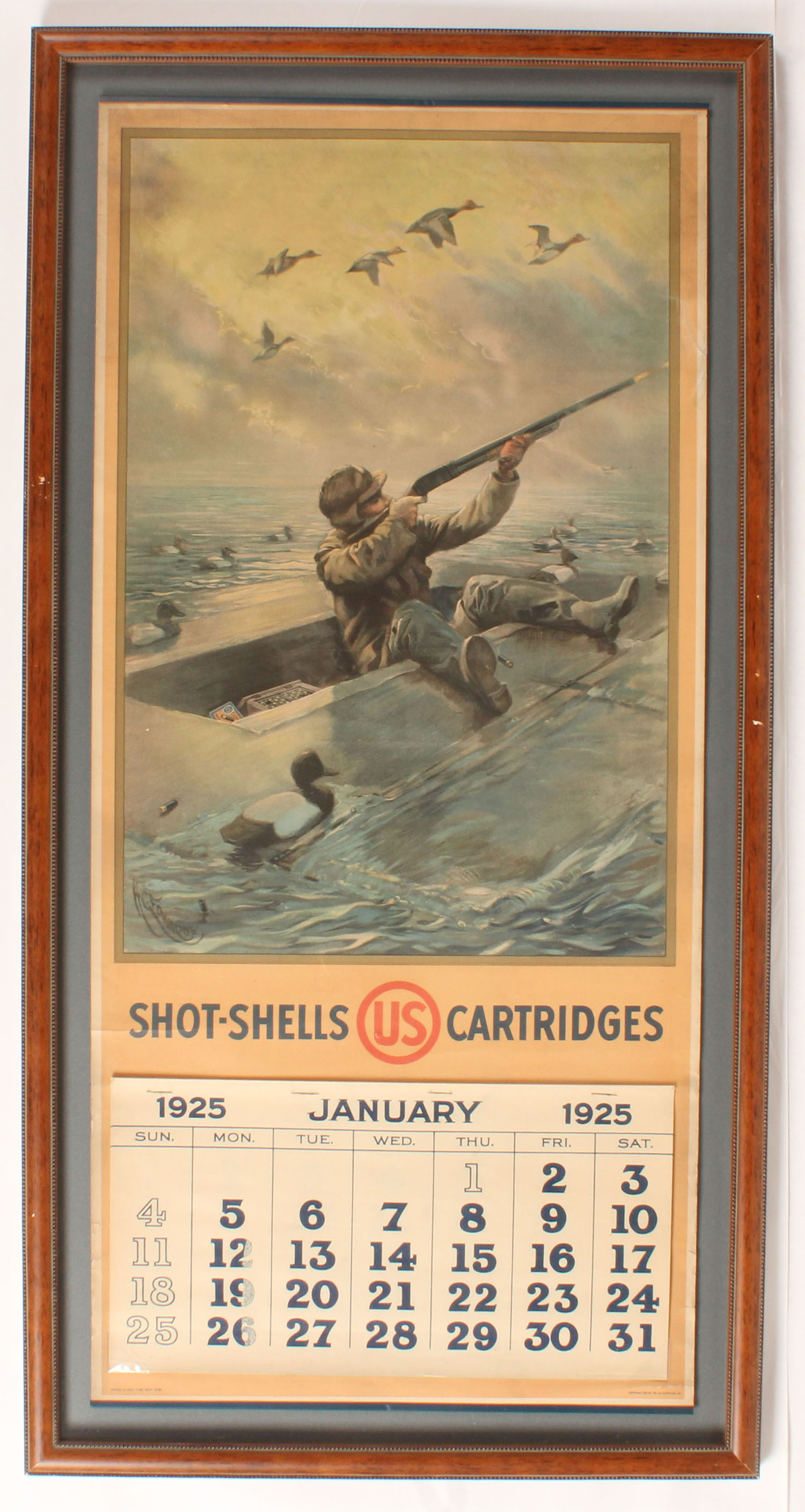 1925 US Cart. Co. Calendar, RARE & highly sought after full color image of duck hunter in sink boat with flock of redheads above & some 2pc shotshell boxes in boat, artist H.C. Edwards, has metal bands top & bottom with brass hanger, FULL pad of pages, 16 1/4'' x 35 1/4'', calendar is excellent with one tear to upper right side & edges shows light age soling, great colors, framed. Grade: Excellent + - Value: 3000 to 6000