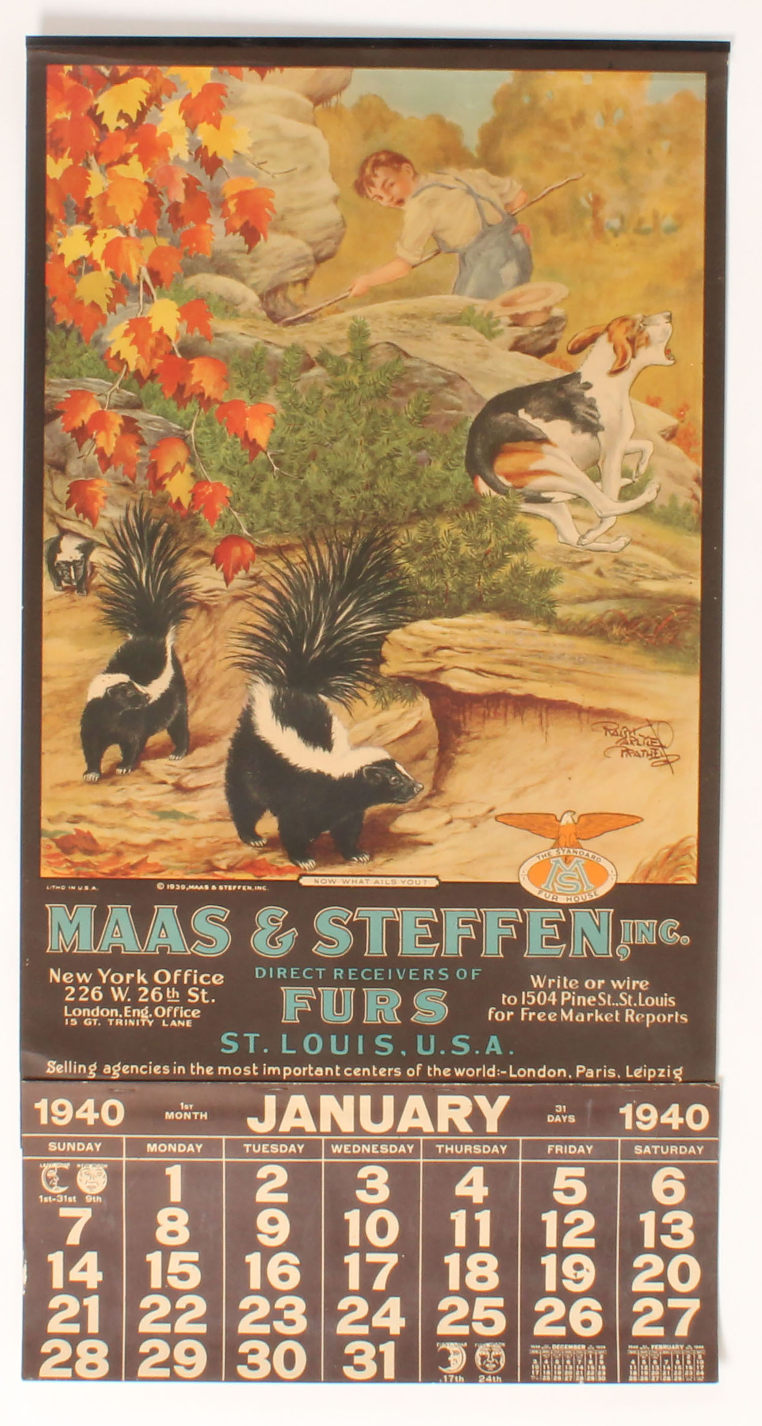 Mass & Steffen 1940 Calendar, ''NOW WHAT AILS YOU?'', pictures young boy with his beagle running from a family of skunks, 13 1/2'' x 26'', has original band with brass hanger, near mint with no wear, Full Pad of Pages, has great color with beautiful image. Grade: Excellent ++ - Value: 800 to 2000