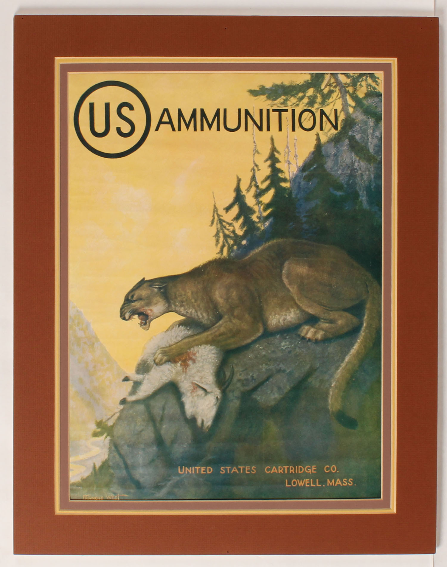 U.S. Cart. Co. AMMUNITION Poster by Francis West, has full color image of cougar with his mountain goat kill on a cliff, has metal bands top & bottom with brass hanger, 13 1/2'' x 18 1/4'', circa 1890's, perfect color with one small edge tear, EXTREMELY RARE & FIRST ONE WE HAVE SEEN! Grade: Excellent ++ - Value: 2000 to 5000