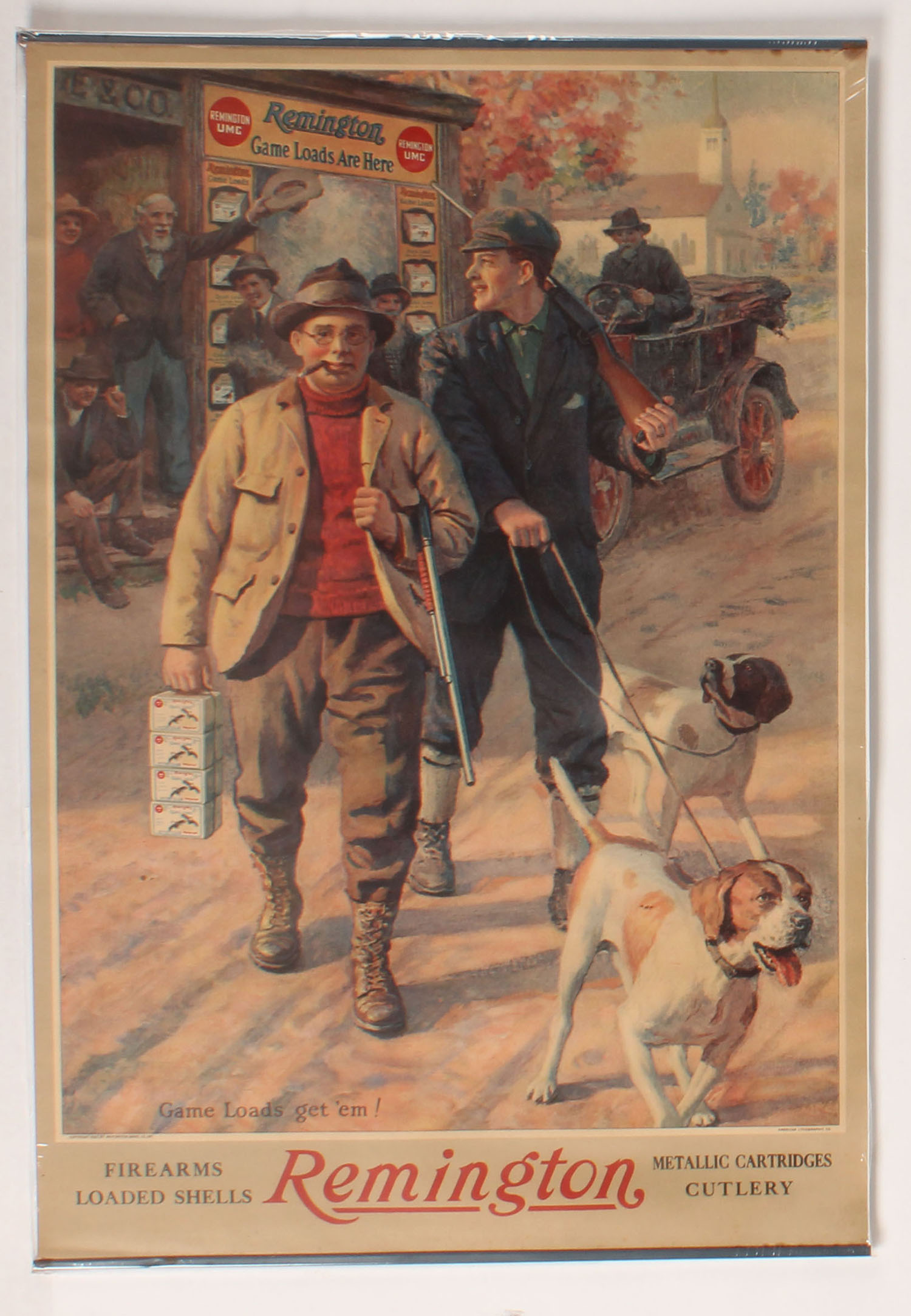 Remington Game Loads Poster, ''GAME LOADS GET 'EM!'', picture a self portrait of Philip R. Goodwin (Artist), shows him leaving a Remington sporting goods store with 4 2pc shotshell boxes, a pump shotgun & his hunting dogs, dated 1922, 15'' x 22 1/4'', has metal bands top & bottom with original paper hanger, near mint other than a few small soil spots near bands. Grade: Excellent + - Value: 2000 to 4000