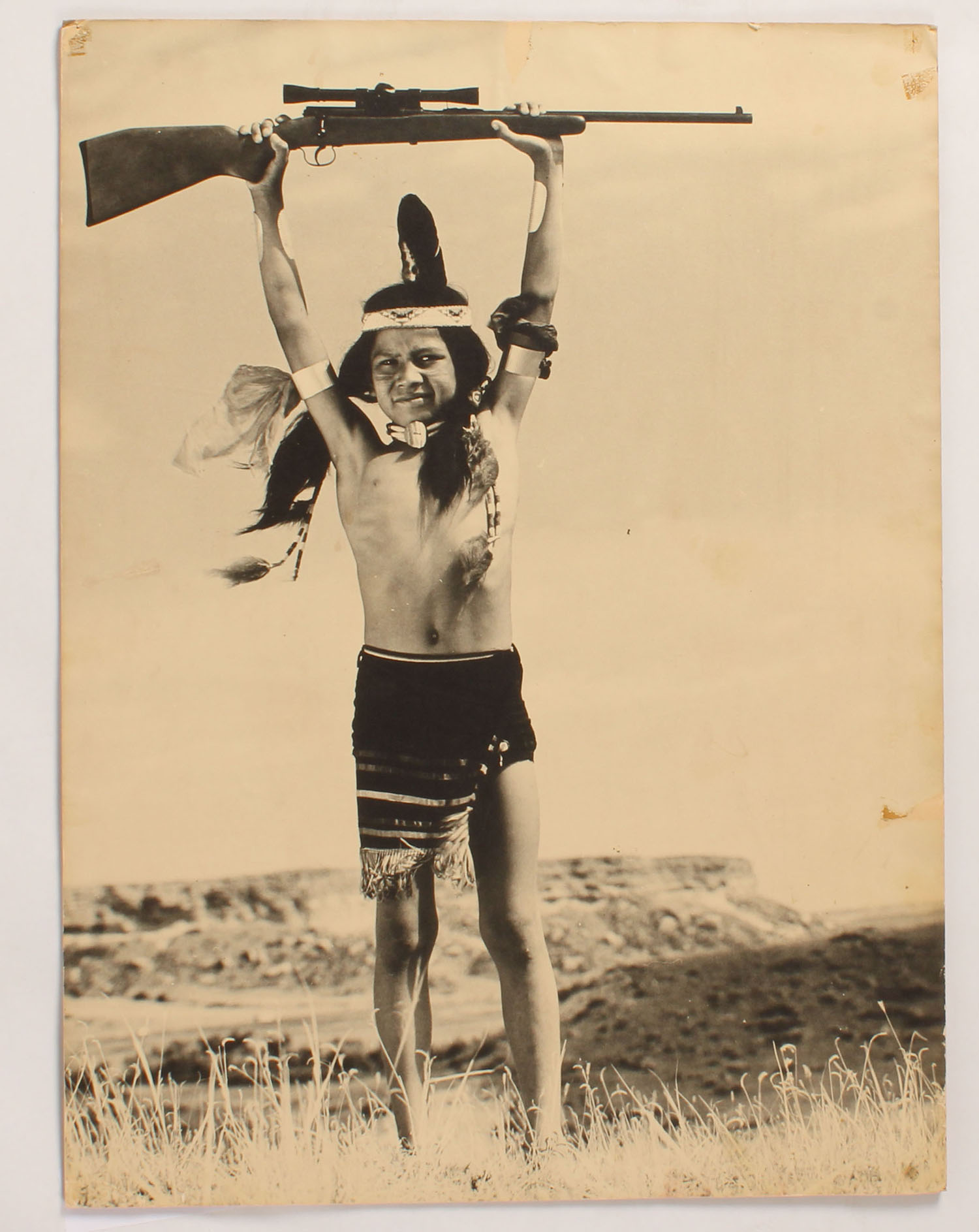 Winchester Poster that is unmarked, black & white image of Indian boy holding a rifle over his head, poster is mounted onto heavy cardboard, 18'' x 24'', shows corner dings. Grade: Very Good ++ - Value: 10 to 100
