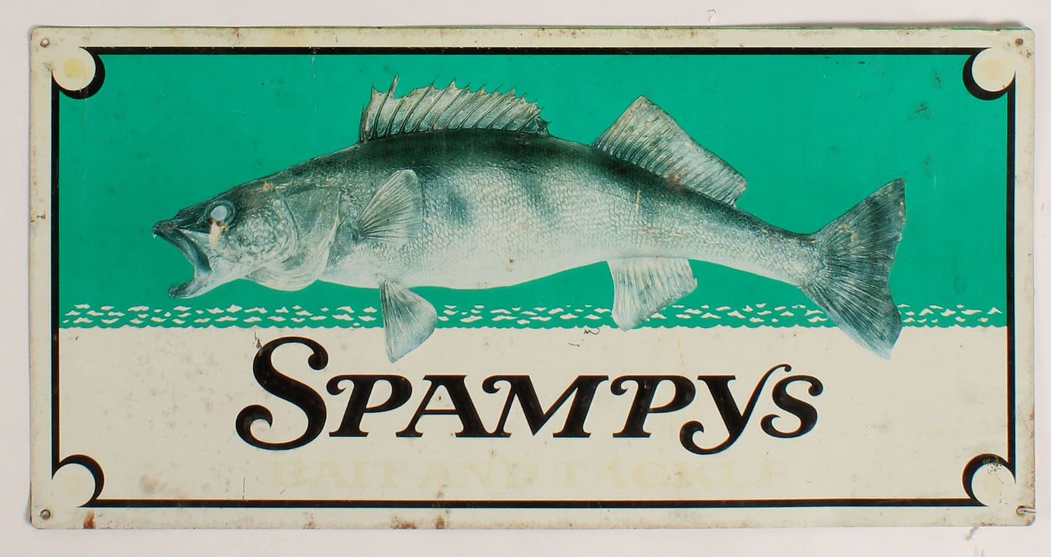 Spampys fish metal sign, this one is embossed around the Walleye & lettering, 24'' x 12''. Grade: Very Good ++ - Value: 20 to 100
