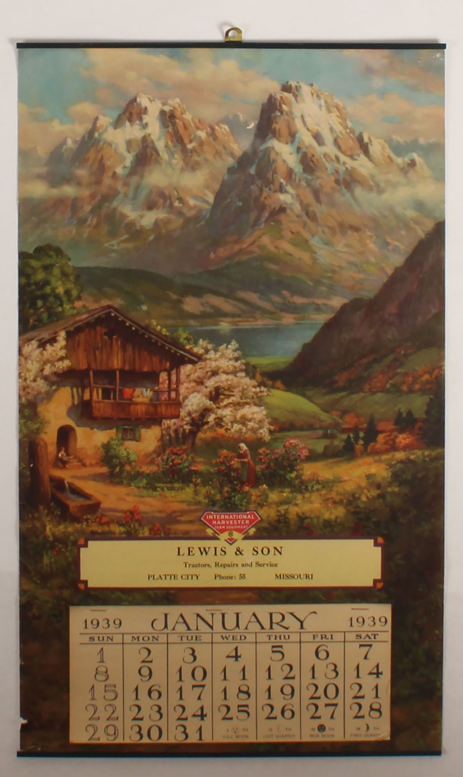 1939 International Harvester calendar, pictures a farm with lake & mountains in background, full pad of pages, 12 1/2'' x 21''. Grade: Excellent - Value: 10 to 100