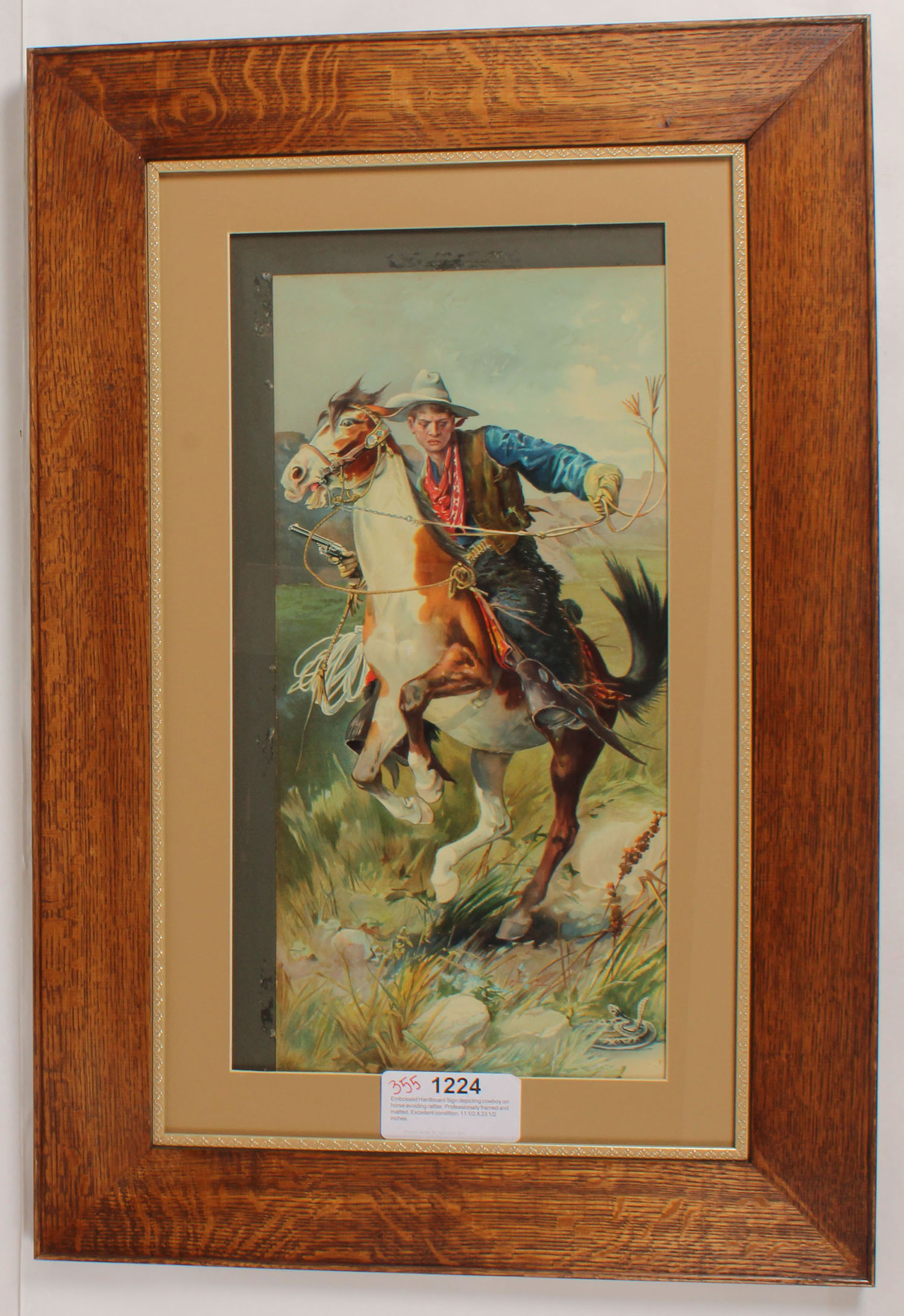 Embossed hardboard sign pictures cowboy on horseback avoiding a rattler, 11 1/2'' x 23 1/2'', framed & matted, poster has moved under the matting. Grade: Excellent - Value: 20 to 200