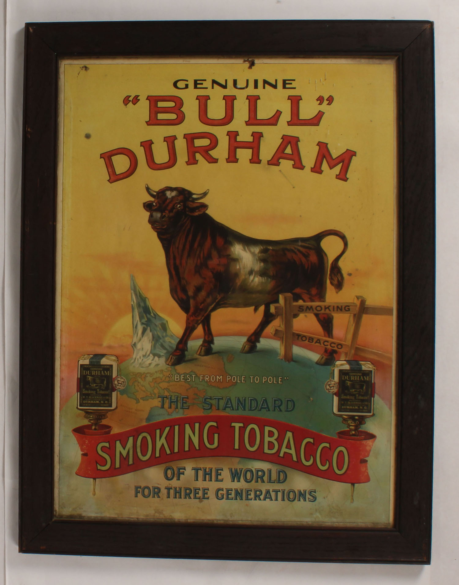 BULL DURHAM Smoking Tobacco cardboard poster, pictures large bull steer with two packs of Tabacco, shows some wear, 18 1/2'' x 25 1/2'', framed. Grade: Very Good - Value: 50 to 500