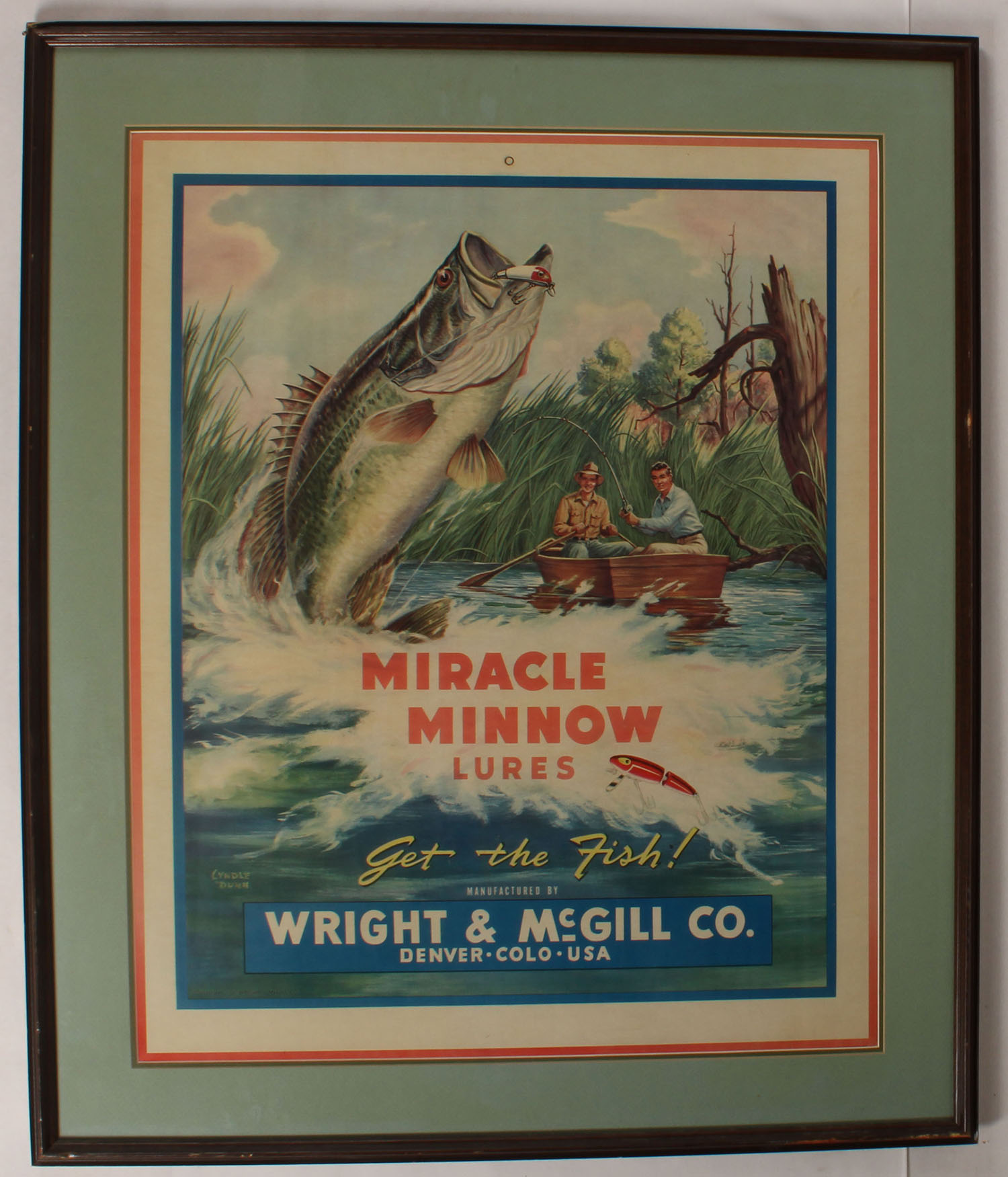 Wright & McGill MIRACLE MINNOW LURES poster, pictures fisherman with large bass on the line jumping, 23'' x 29'', framed. Grade: Excellent - Value: 40 to 250