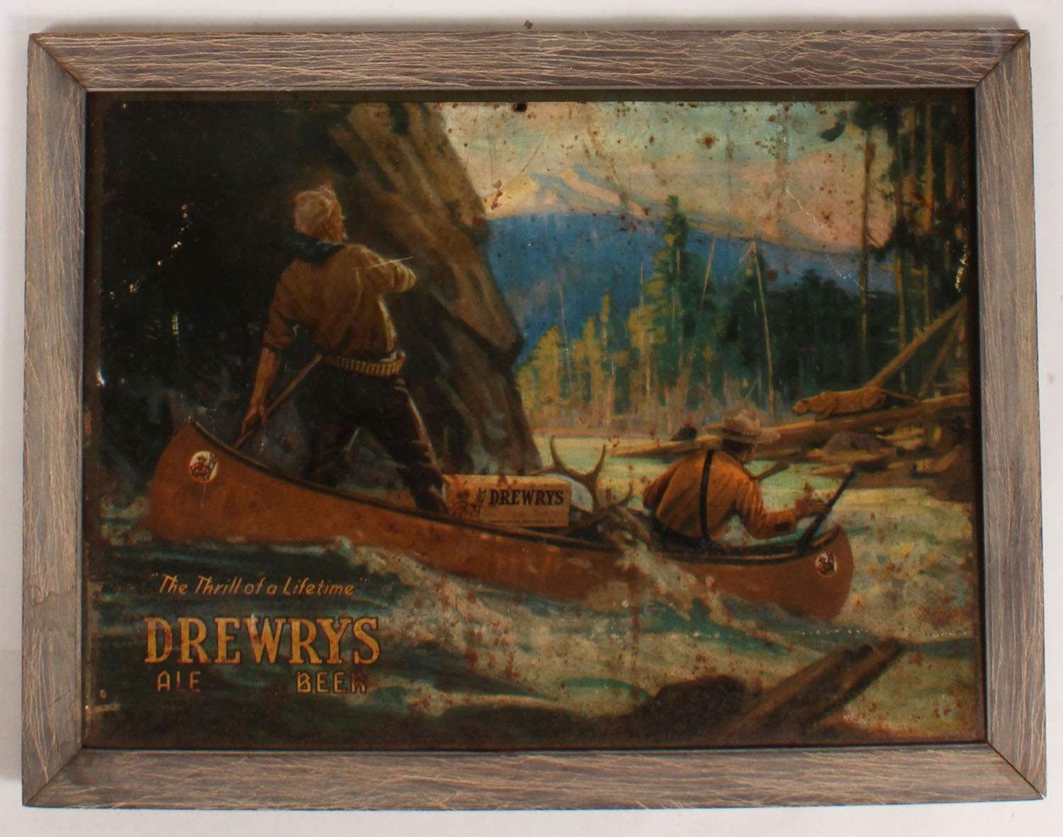 Dryers Ale Beer metal sign, pictures two hunters going through rapids on river with a mountain lion coming out on a log towards a porcupine, shows rust spots through out, 23'' x 16 1/2'', framed. Grade: Good ++ - Value: 10 to 50