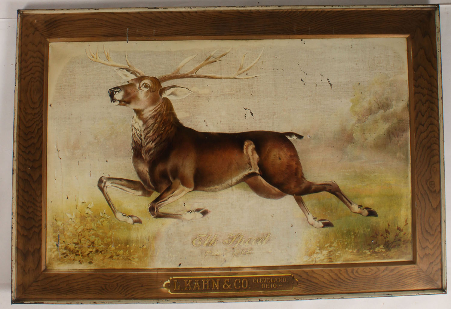 L. Kahn & CO Cleveland OH, Elk SHEED PURE RYE, metal sign, pictures large stag funning, self framed, shows some wear, 38'' x 25 1/2'' image size. Grade: Very Good - Value: 50 to 500